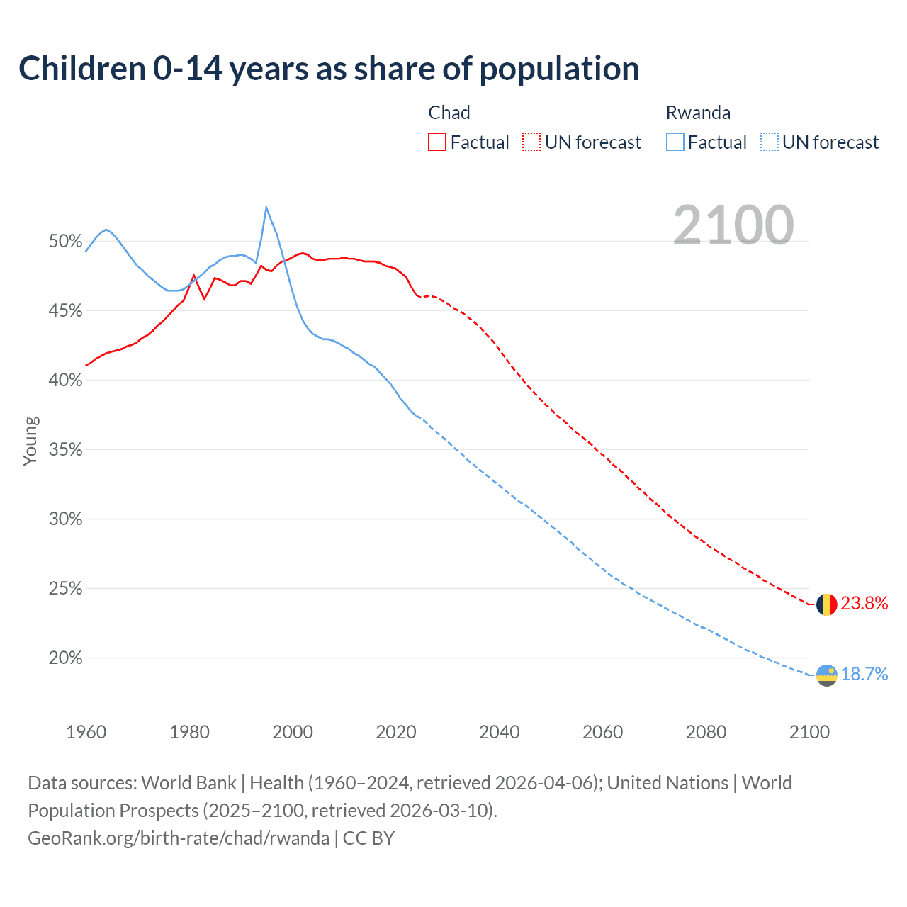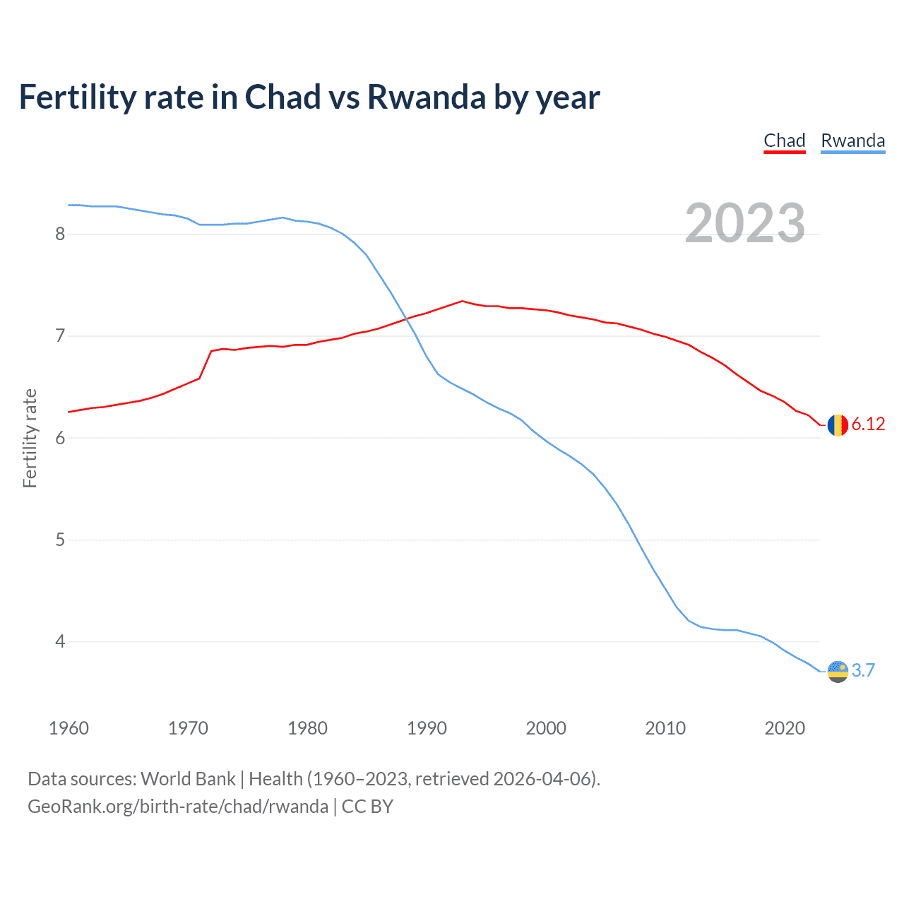 According to the latest available data on birth rates, the fertility rate in Chad was 6.12 children per woman in 2023, compared to 3.7 in Rwanda in 2023. The replacement level is considered to be 2.1 children per woman.