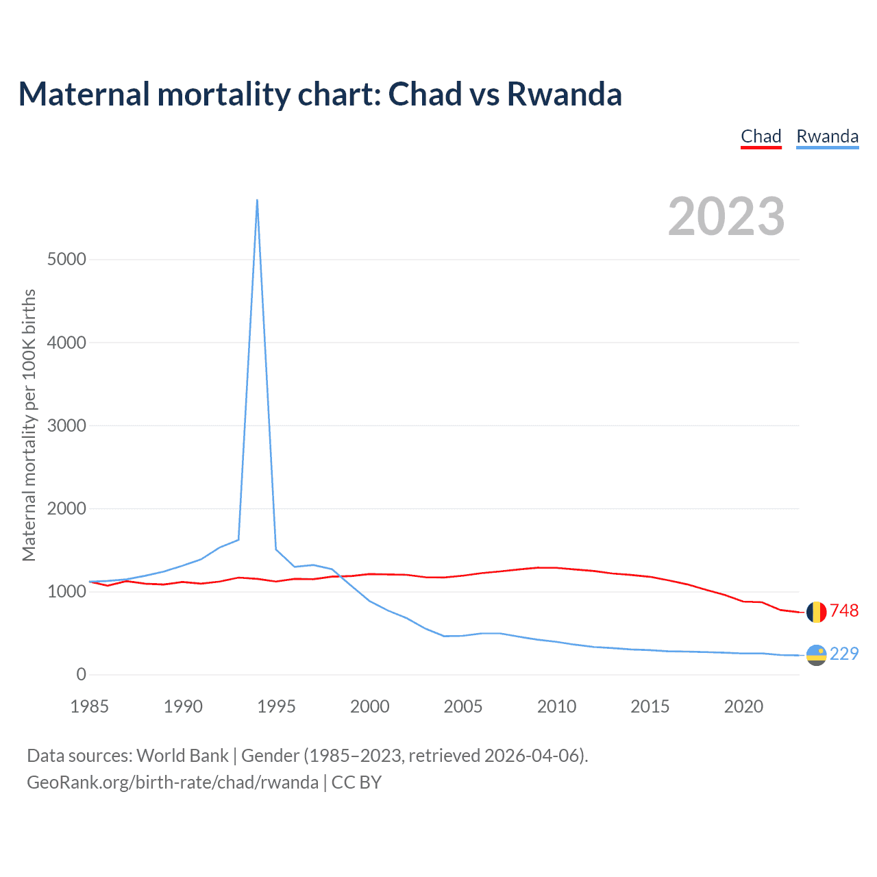 The maternal mortality rate, which is the probability of dying during childbirth or within 42 days of pregnancy termination, is 748 deaths per 100,000 live births in Chad, compared to 229 deaths in Rwanda.