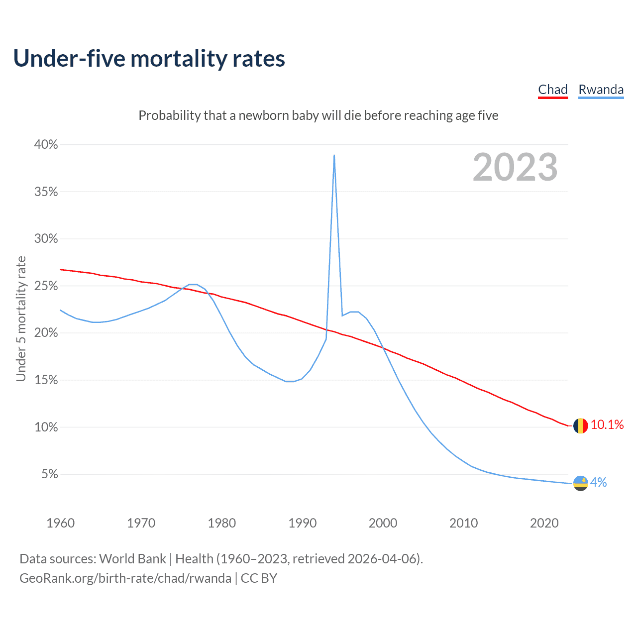 The chance that a newborn baby will die before reaching age five is 10.1% in Chad and 4% in Rwanda. Above is a chart with historical data on under-five mortality rates.