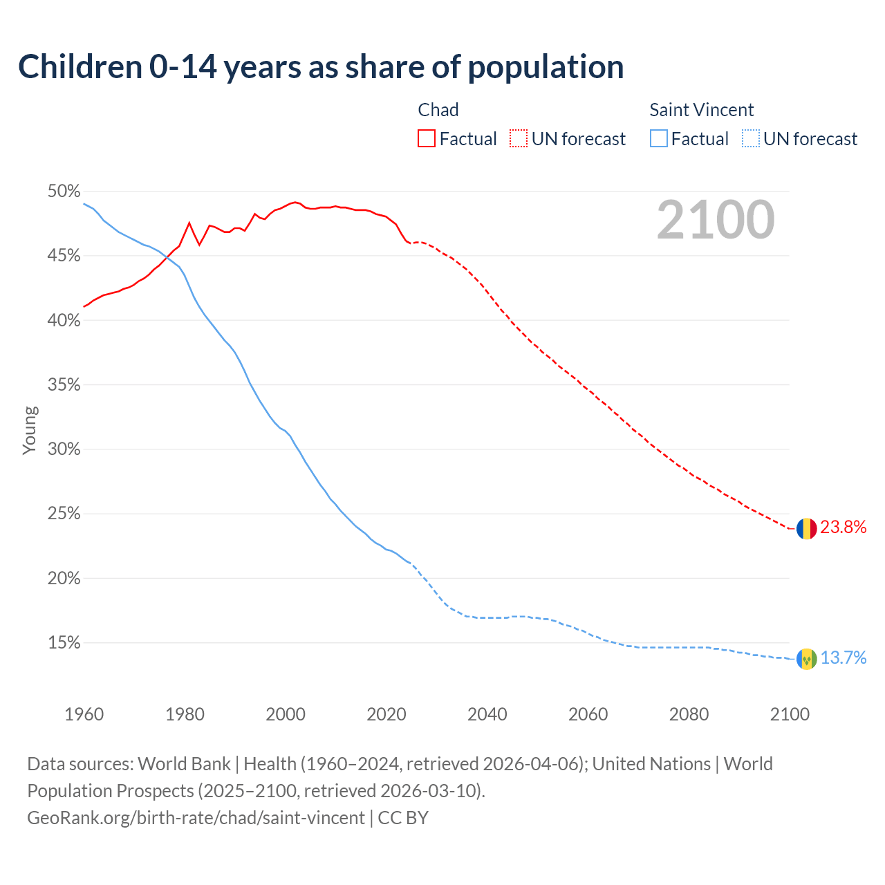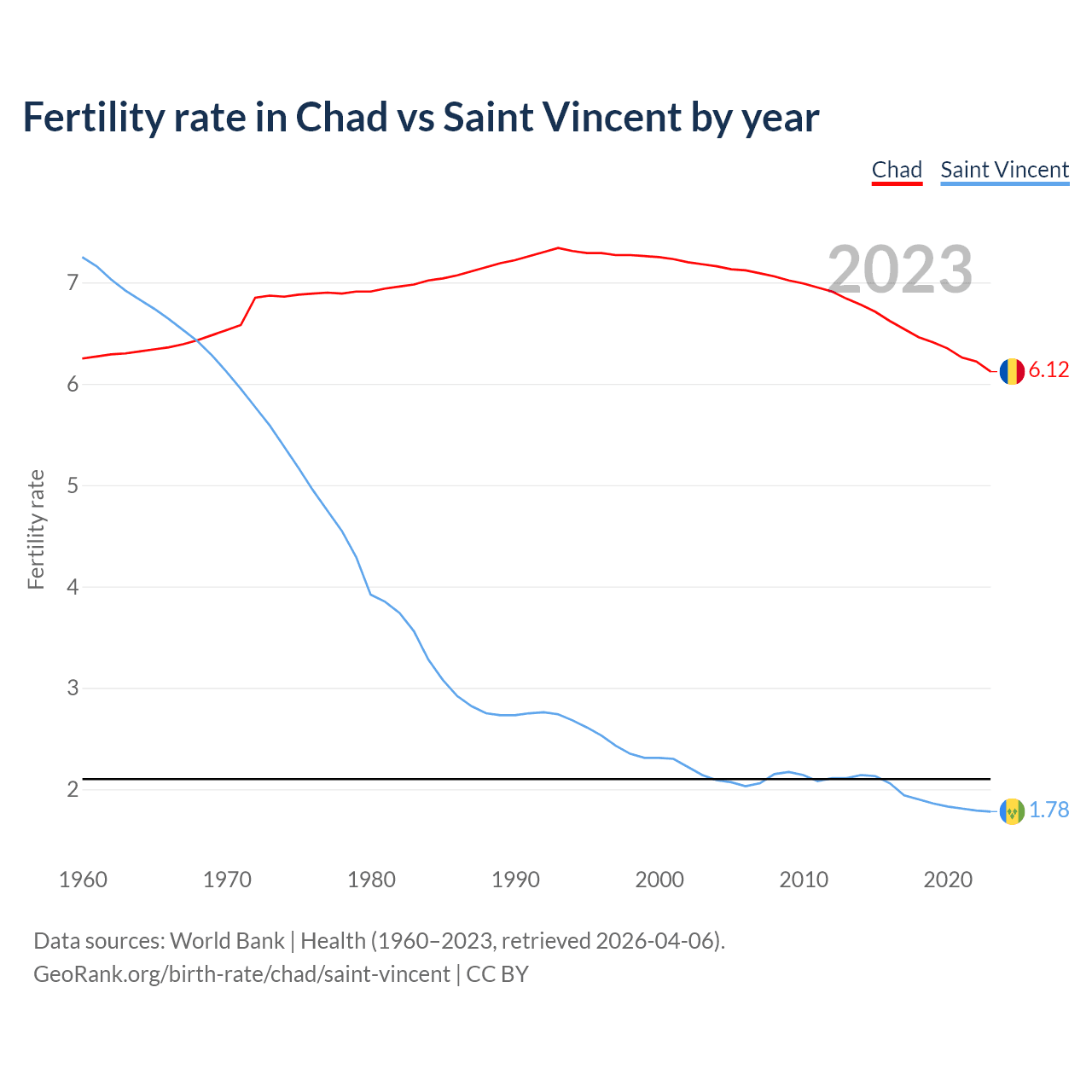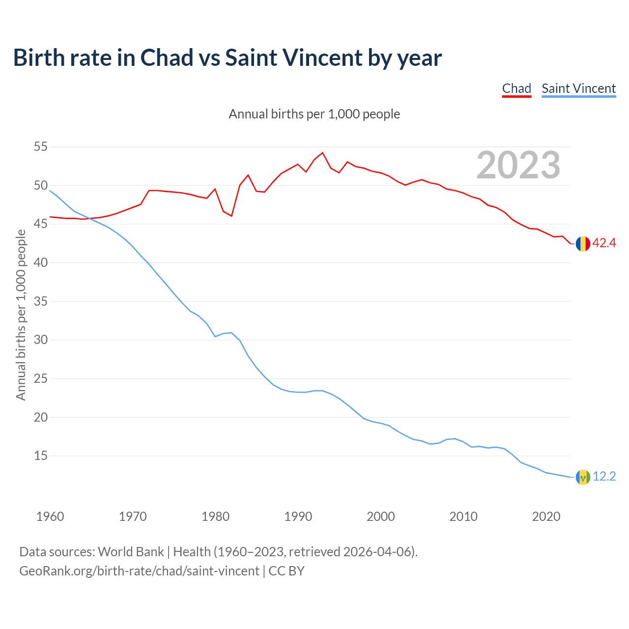 Chad has an annual birth rate of 42.4 births per 1,000 people, compared to 12.2 for Saint Vincent. The average number of children a woman is expected to have during her lifetime — the fertility rate, is 6.12 in Chad and 1.78 in Saint Vincent — 71% difference.