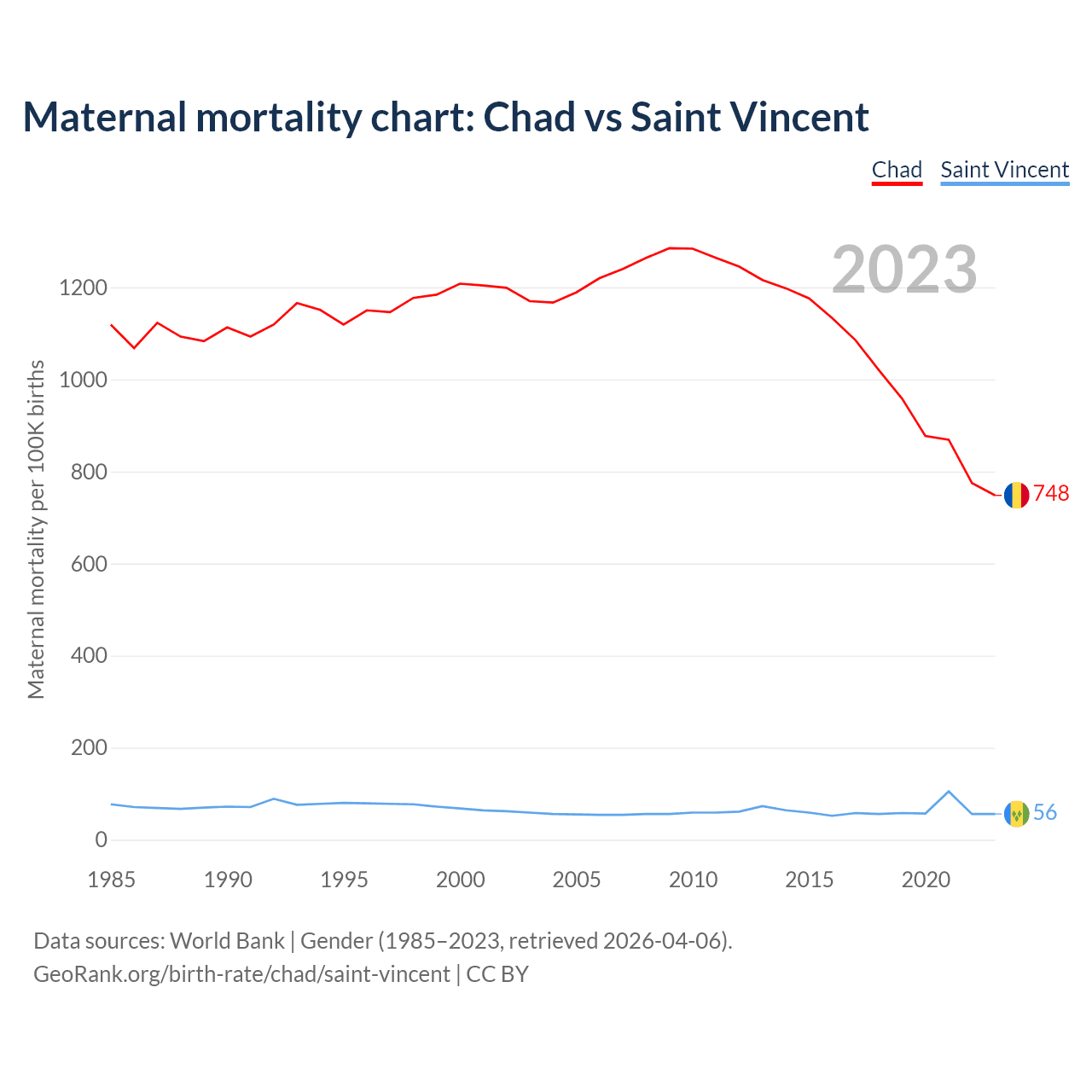The maternal mortality rate, which is the probability of dying during childbirth or within 42 days of pregnancy termination, is 748 deaths per 100,000 live births in Chad, compared to 56 deaths in Saint Vincent.