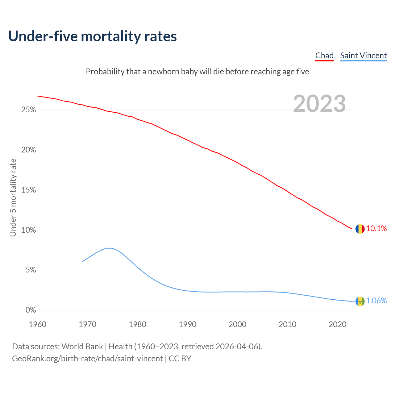 The chance that a newborn baby will die before reaching age five is 10.1% in Chad and 1.06% in Saint Vincent. Above is a chart with historical data on under-five mortality rates.