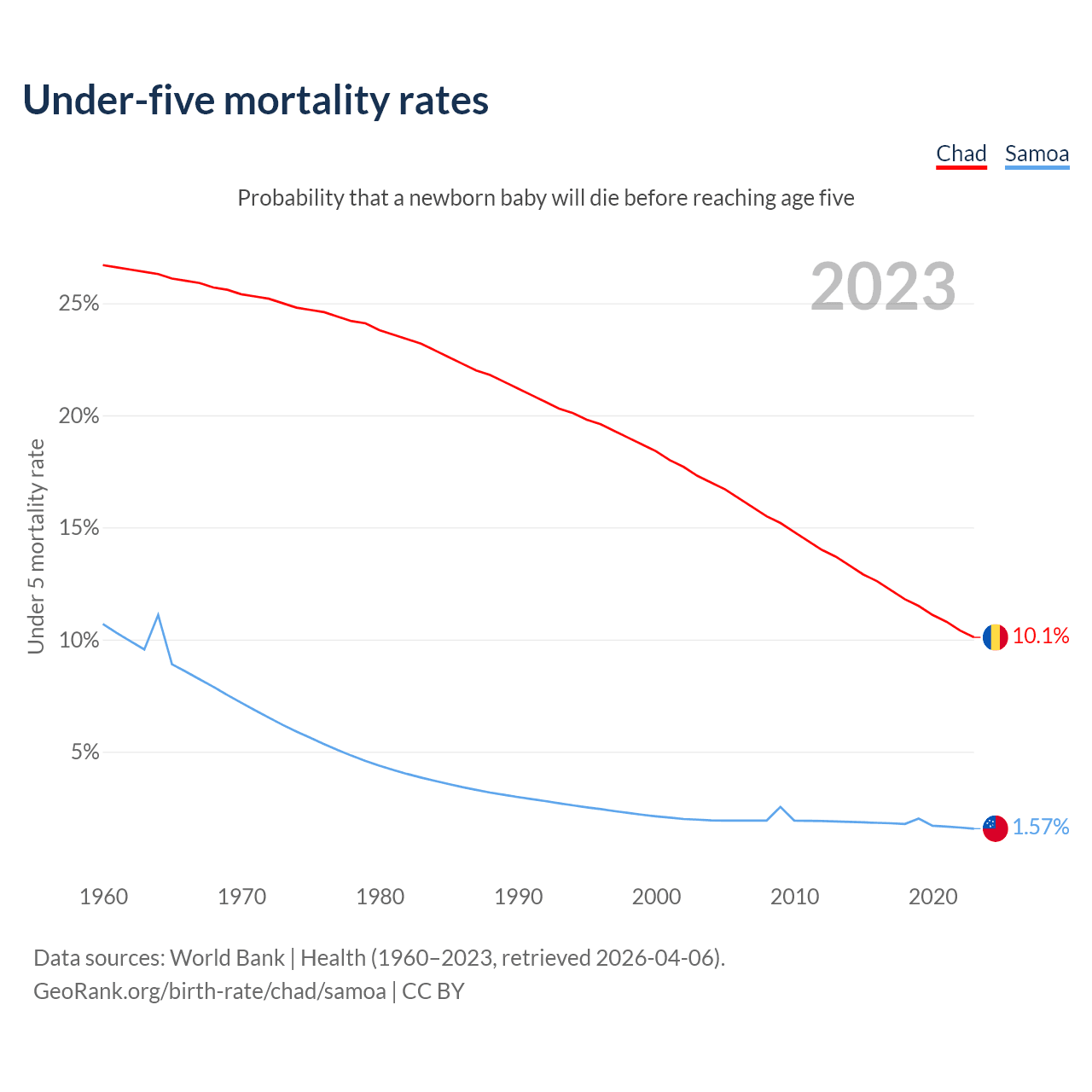 The chance that a newborn baby will die before reaching age five is 10.1% in Chad and 1.57% in Samoa. Above is a chart with historical data on under-five mortality rates.