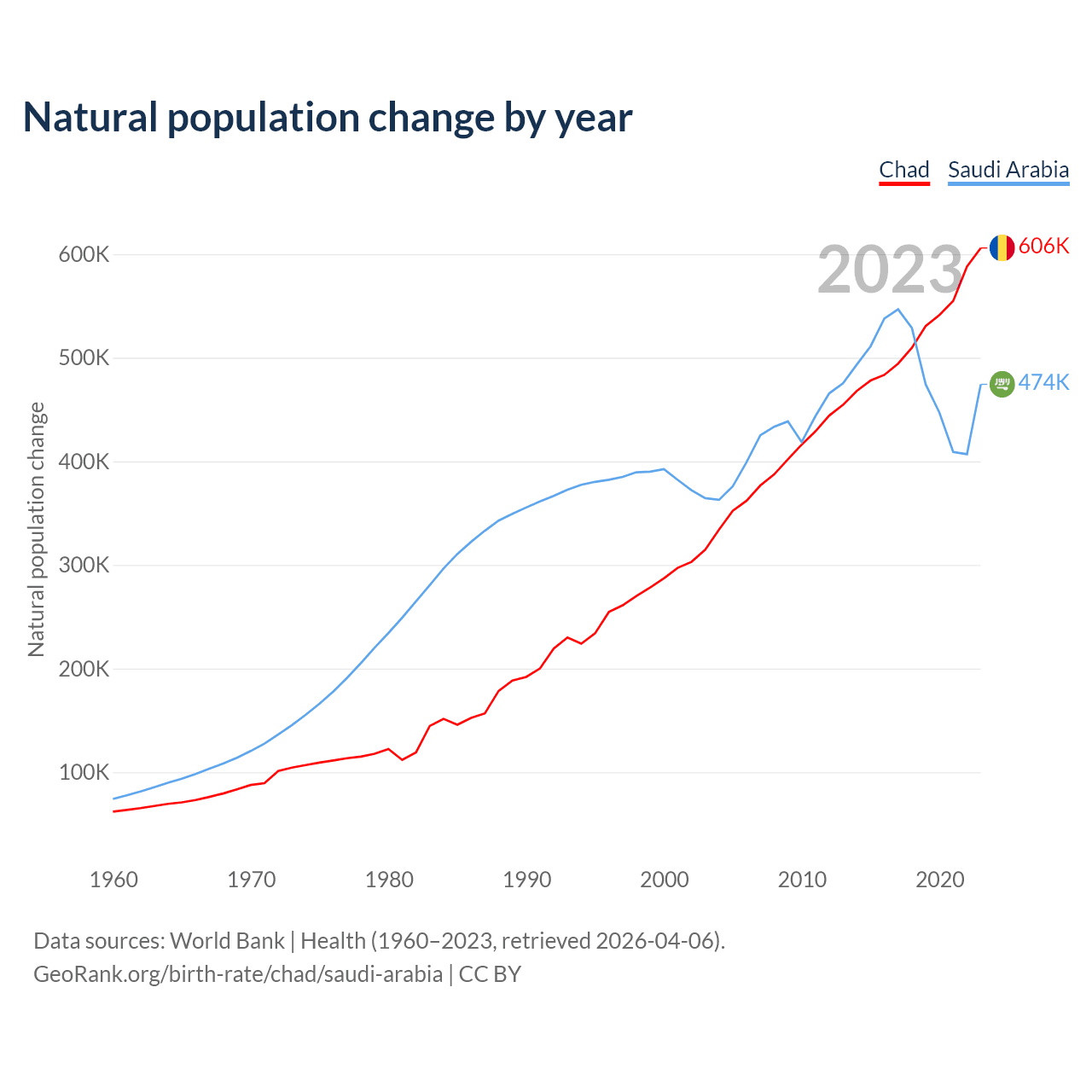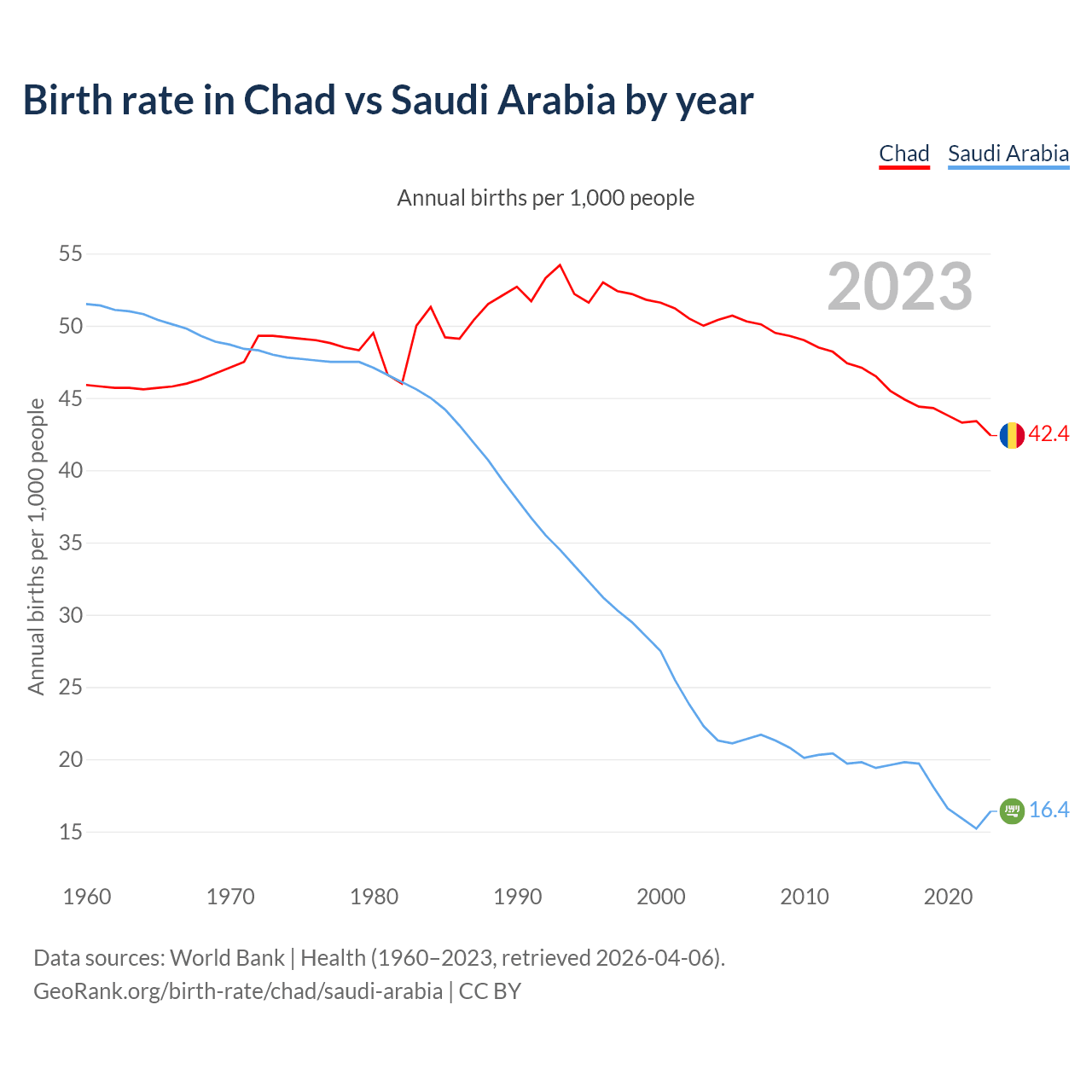 Chad has an annual birth rate of 42.4 births per 1,000 people, compared to 16.4 for Saudi Arabia. The average number of children a woman is expected to have during her lifetime — the fertility rate, is 6.12 in Chad and 2.28 in Saudi Arabia — 62.7% difference.
