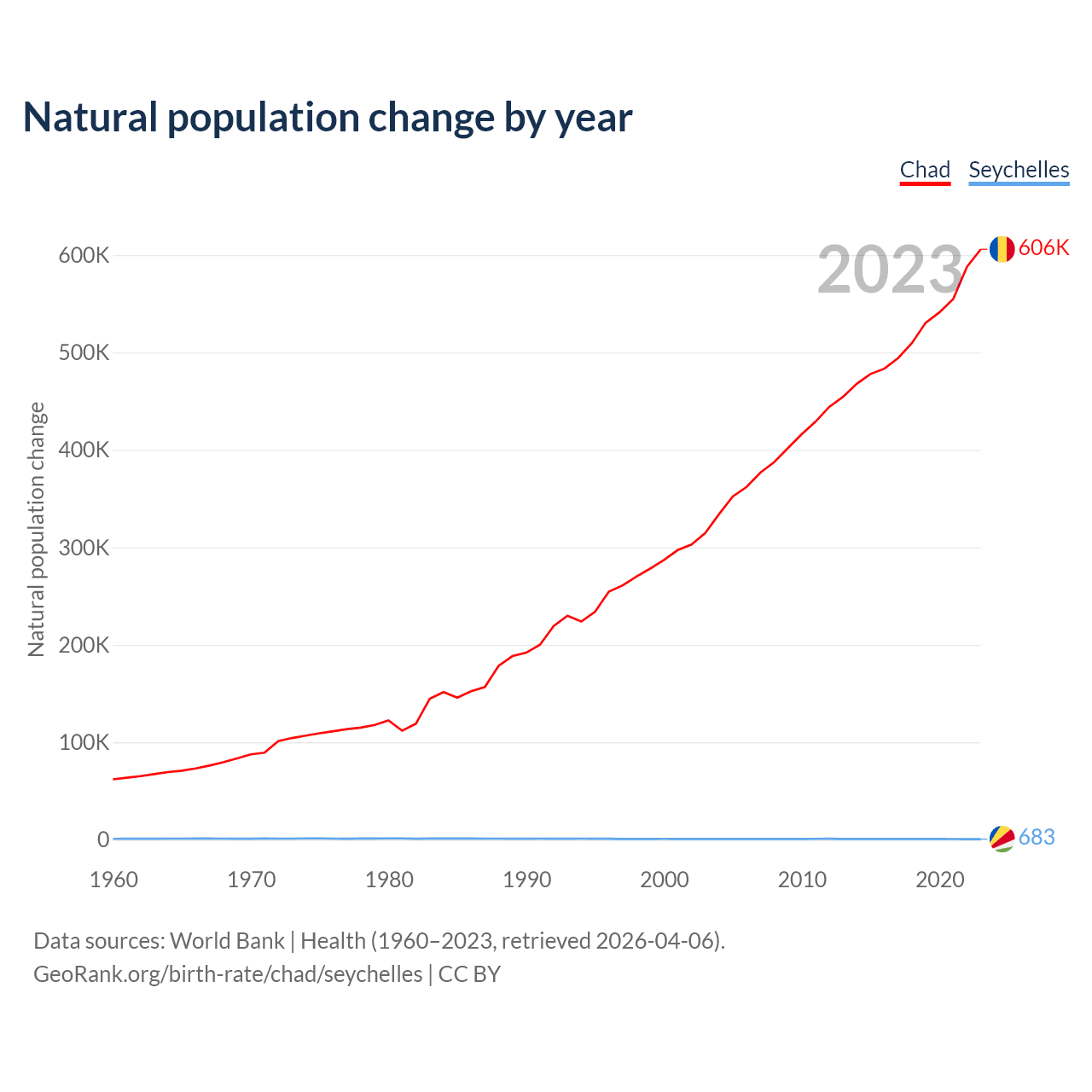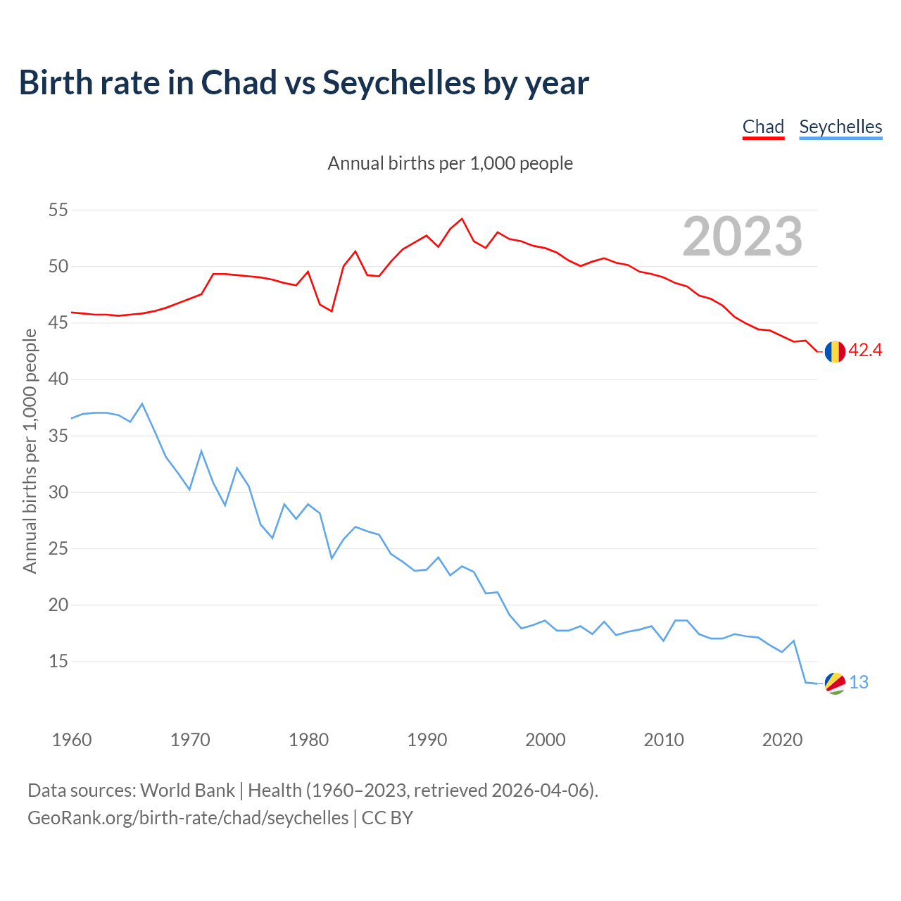 Chad has an annual birth rate of 42.4 births per 1,000 people, compared to 13 for the Seychelles. The average number of children a woman is expected to have during her lifetime — the fertility rate, is 6.12 in Chad and 2.02 in the Seychelles — 67% difference.
