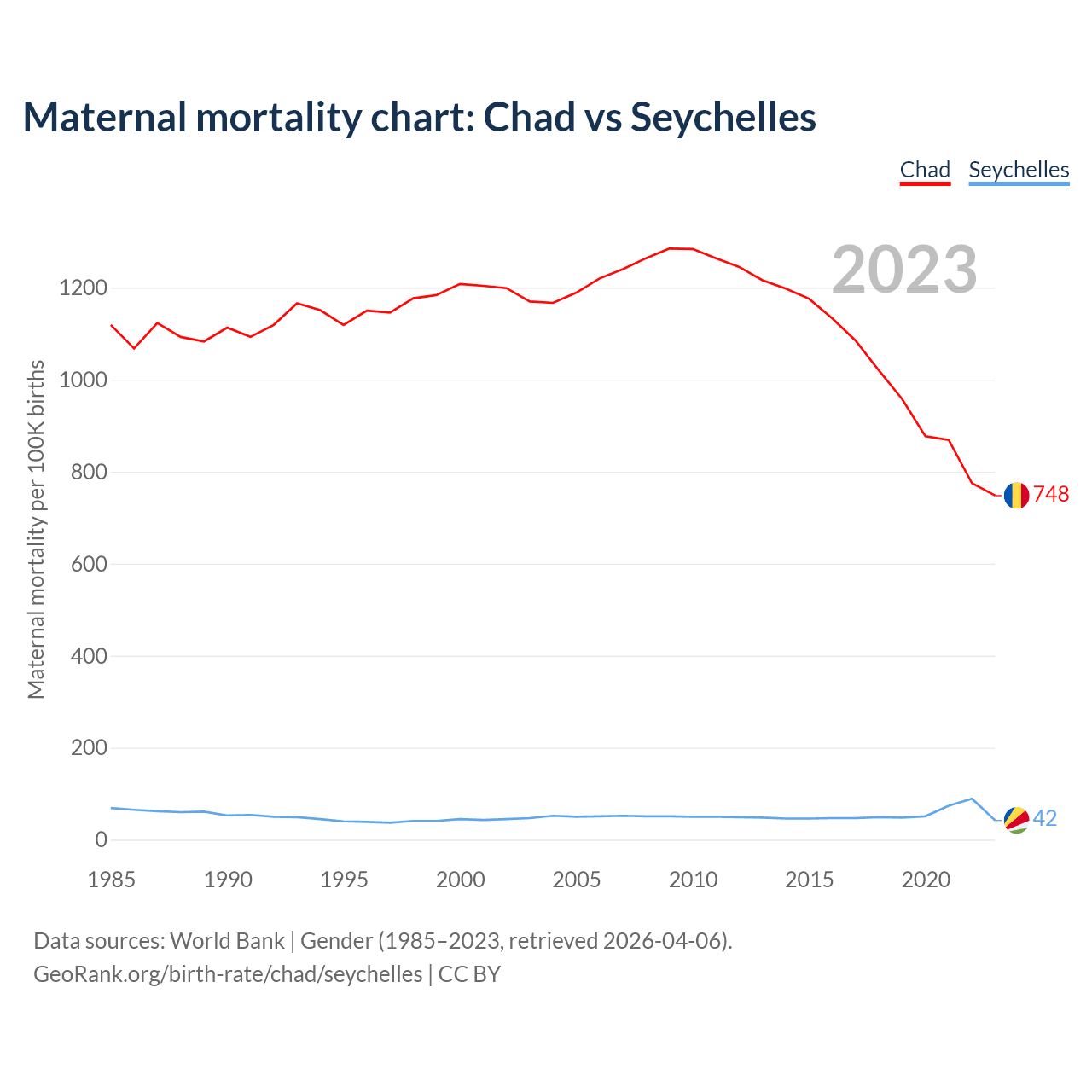 The maternal mortality rate, which is the probability of dying during childbirth or within 42 days of pregnancy termination, is 748 deaths per 100,000 live births in Chad, compared to 42 deaths in the Seychelles.