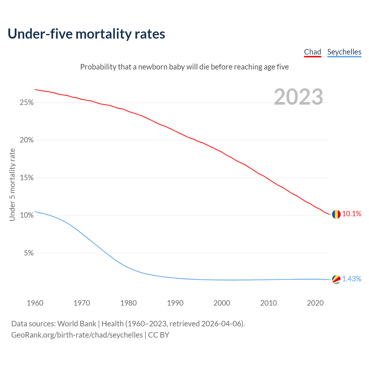 The chance that a newborn baby will die before reaching age five is 10.1% in Chad and 1.43% in the Seychelles. Above is a chart with historical data on under-five mortality rates.