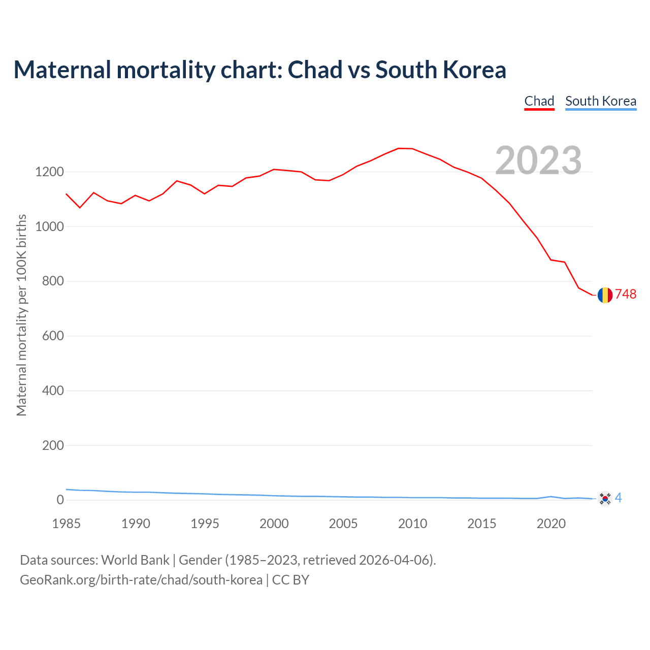 The maternal mortality rate, which is the probability of dying during childbirth or within 42 days of pregnancy termination, is 748 deaths per 100,000 live births in Chad, compared to 4 deaths in South Korea.