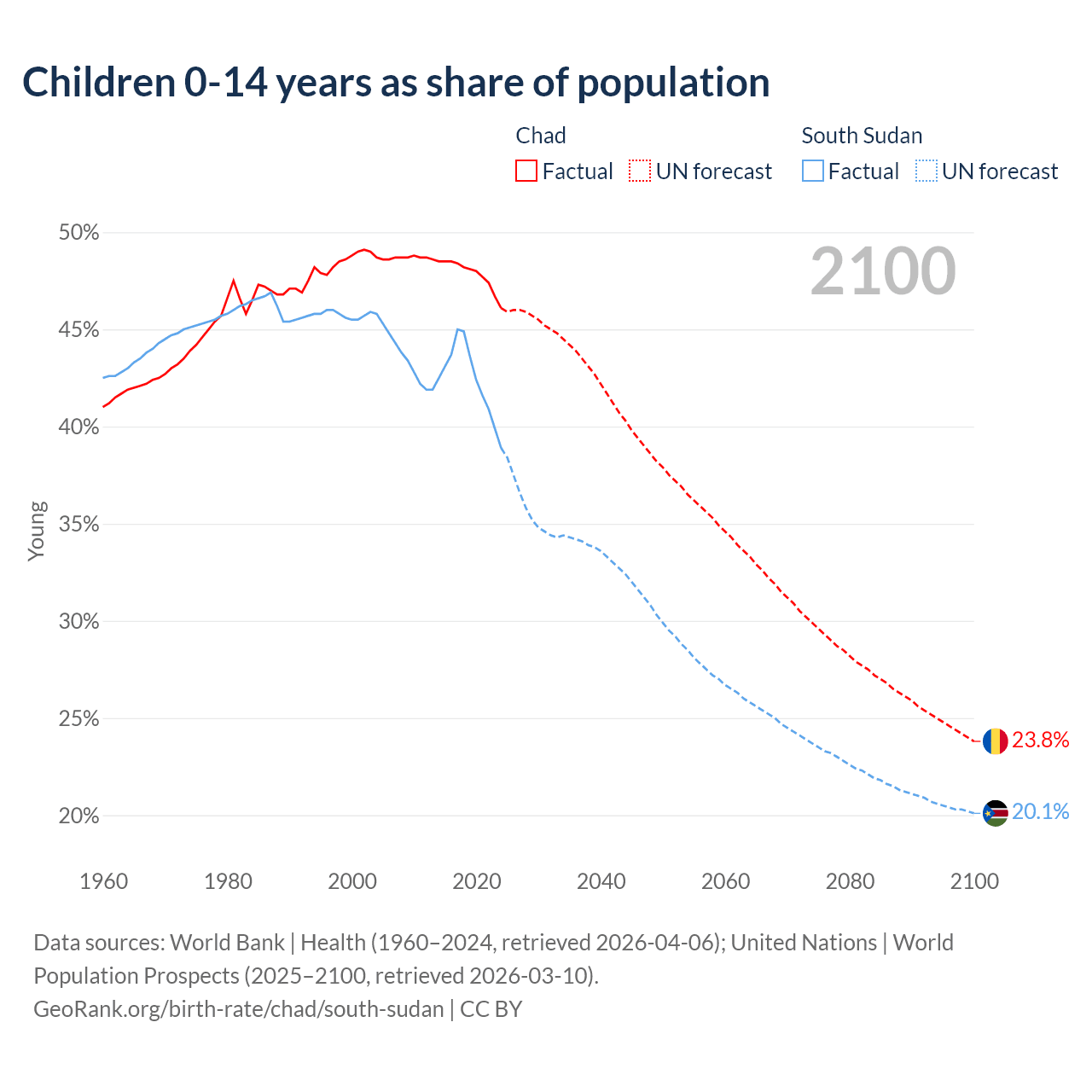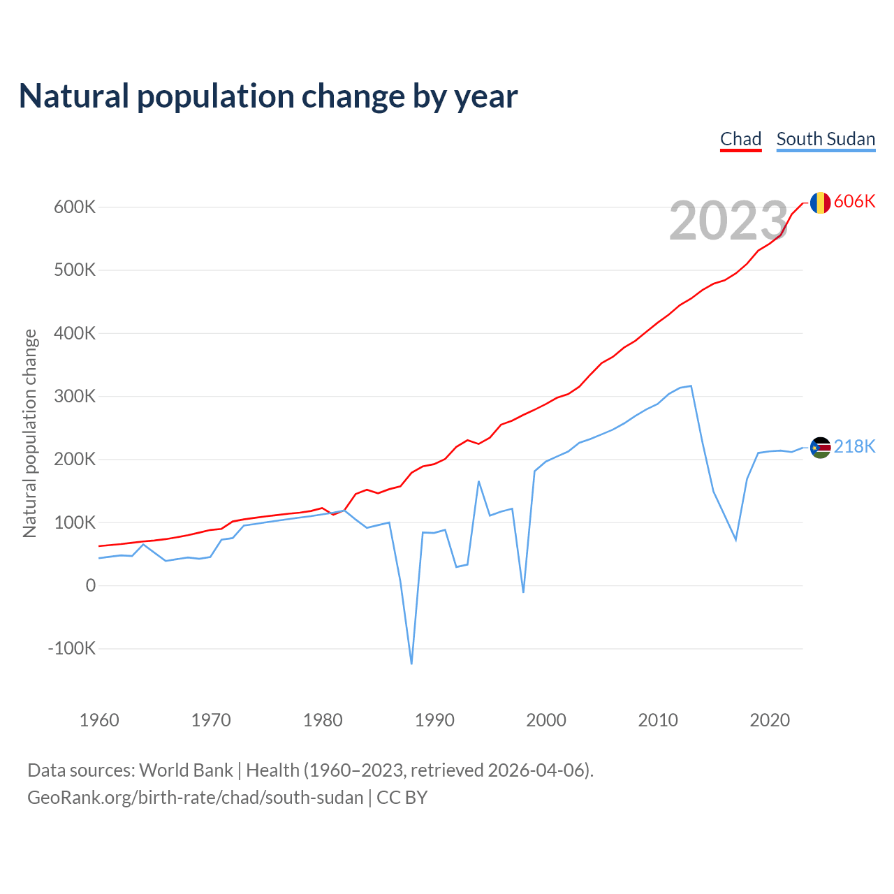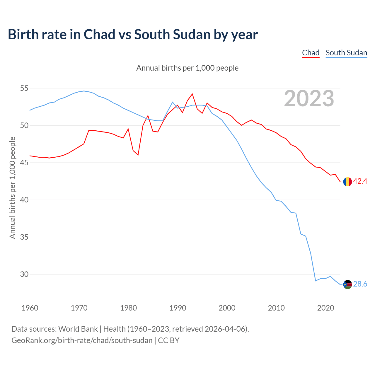 Chad has an annual birth rate of 42.4 births per 1,000 people, compared to 28.6 for South Sudan. The average number of children a woman is expected to have during her lifetime — the fertility rate, is 6.12 in Chad and 3.86 in South Sudan — 36.9% difference.