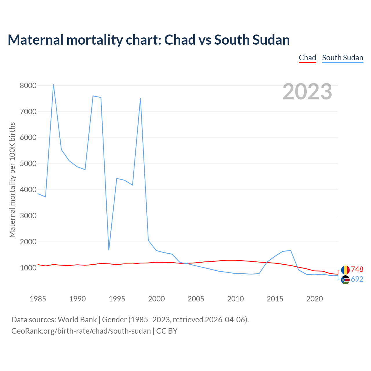 The maternal mortality rate, which is the probability of dying during childbirth or within 42 days of pregnancy termination, is 748 deaths per 100,000 live births in Chad, compared to 692 deaths in South Sudan.