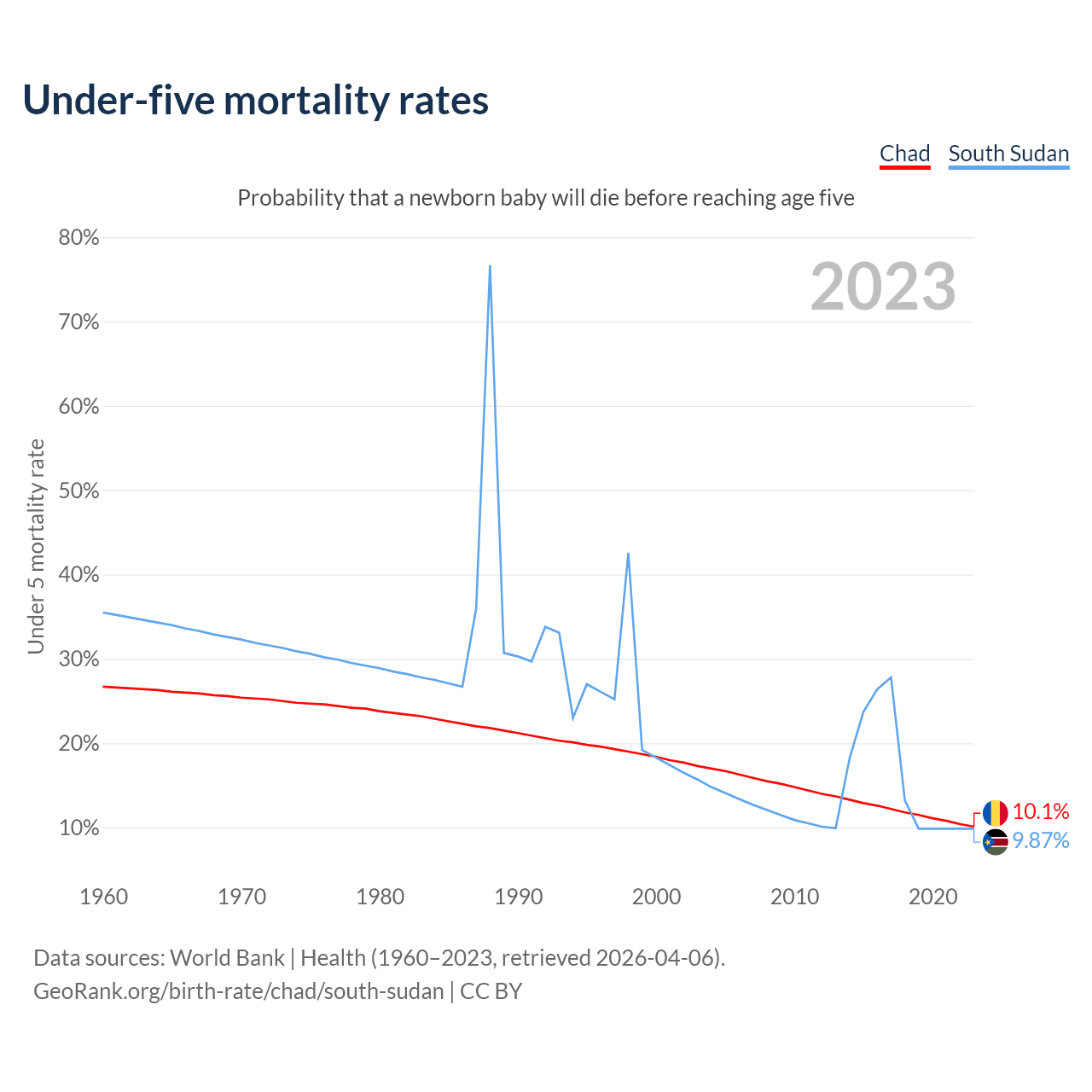 The chance that a newborn baby will die before reaching age five is 10.1% in Chad and 9.87% in South Sudan. Above is a chart with historical data on under-five mortality rates.