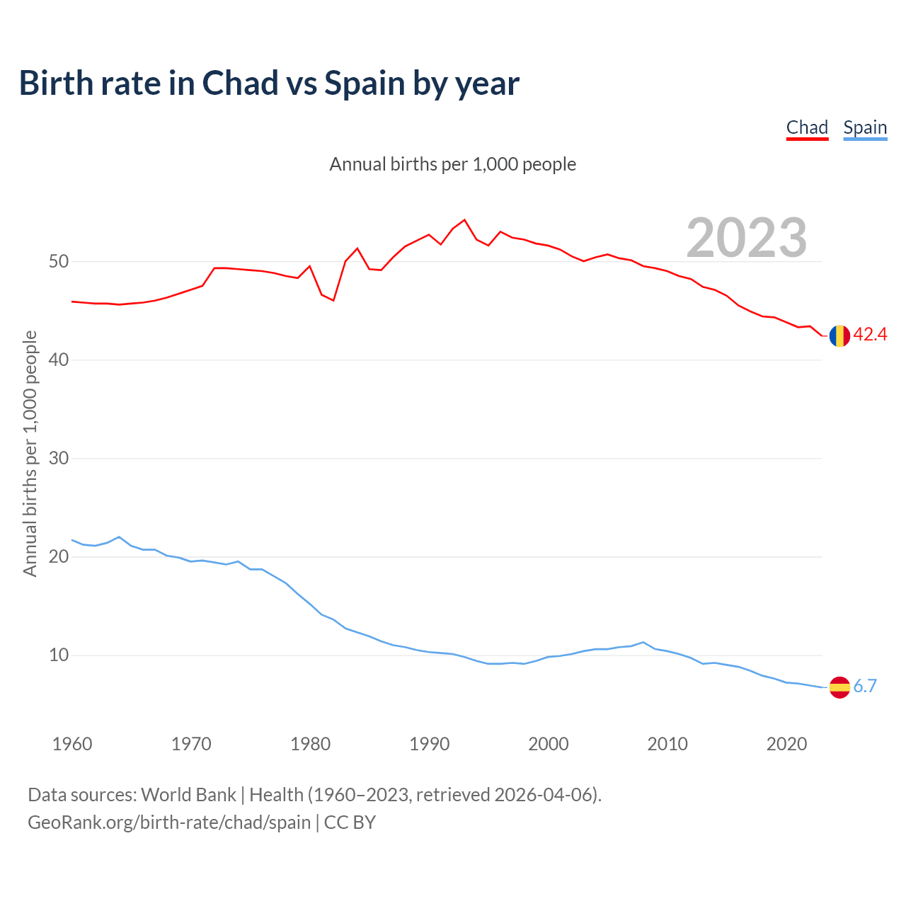 Chad has an annual birth rate of 42.4 births per 1,000 people, compared to 6.7 for Spain. The average number of children a woman is expected to have during her lifetime — the fertility rate, is 6.12 in Chad and 1.12 in Spain — 81.7% difference.