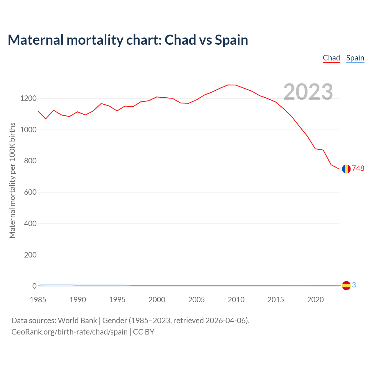 The maternal mortality rate, which is the probability of dying during childbirth or within 42 days of pregnancy termination, is 748 deaths per 100,000 live births in Chad, compared to 3 deaths in Spain.