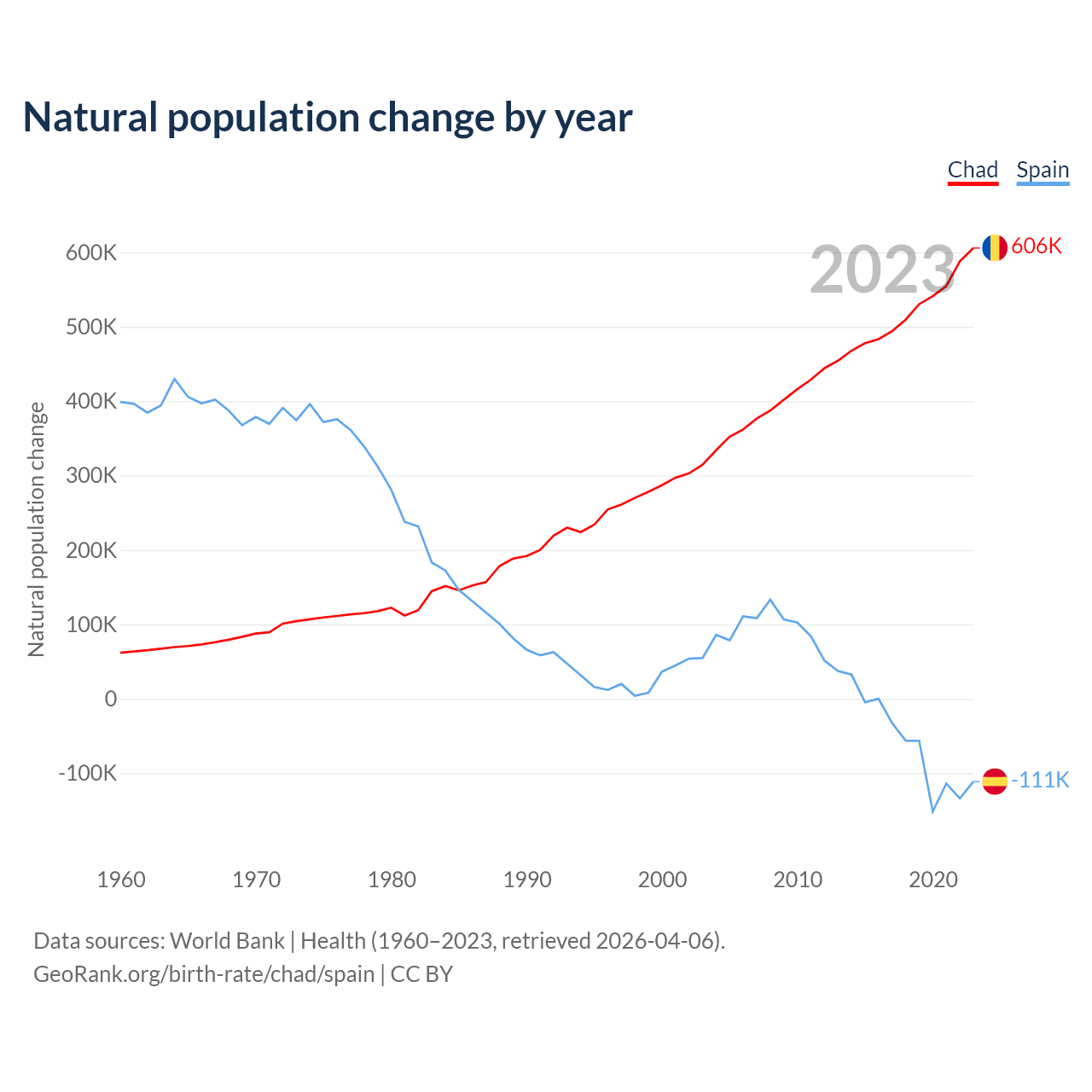 According to the latest available data on birth rates, the fertility rate in Chad was 6.12 children per woman in 2023, compared to 1.12 in Spain in 2023. The replacement level is considered to be 2.1 children per woman.