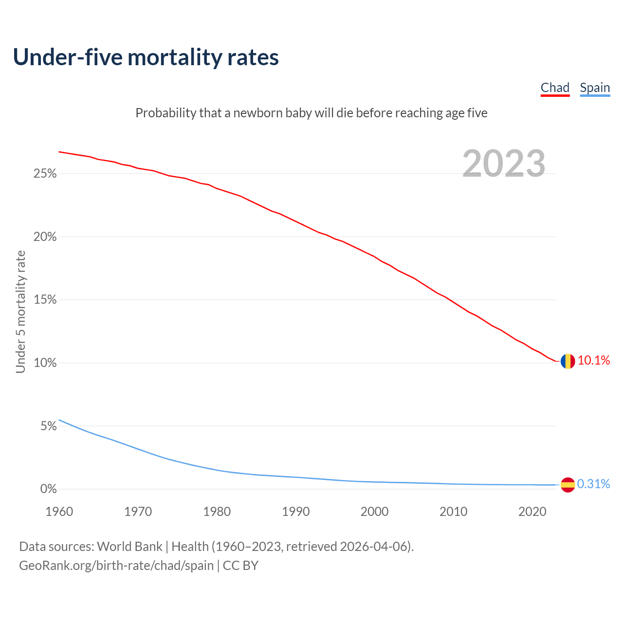 The chance that a newborn baby will die before reaching age five is 10.1% in Chad and 0.31% in Spain. Above is a chart with historical data on under-five mortality rates.