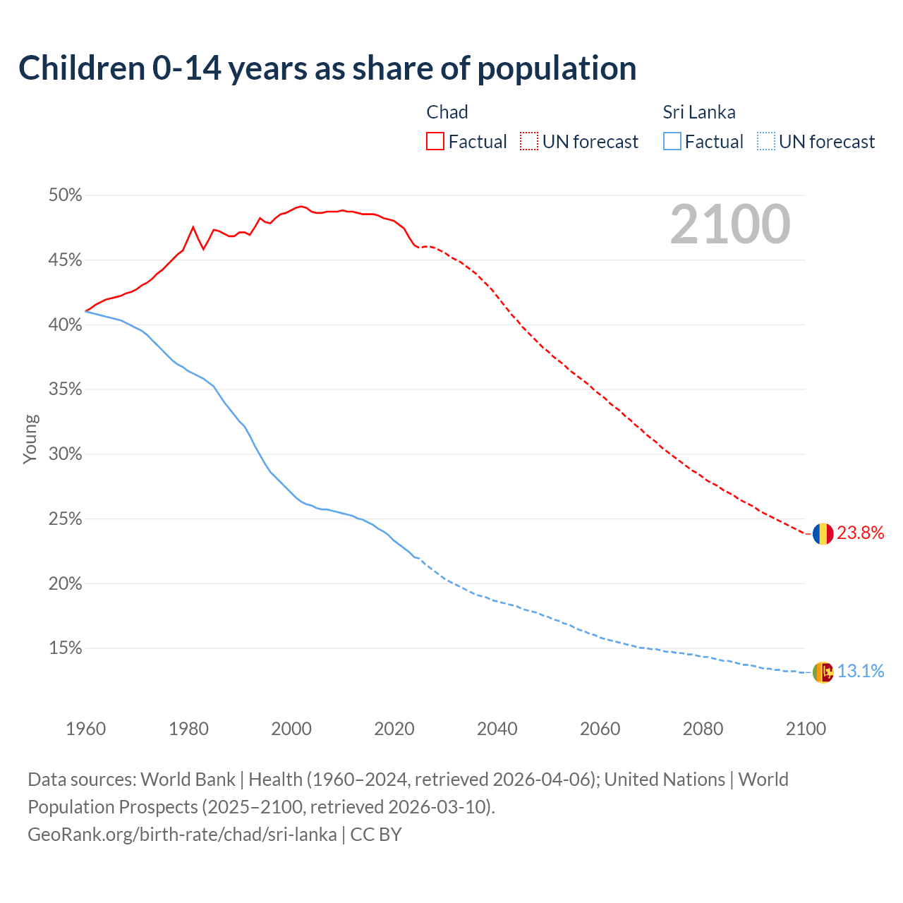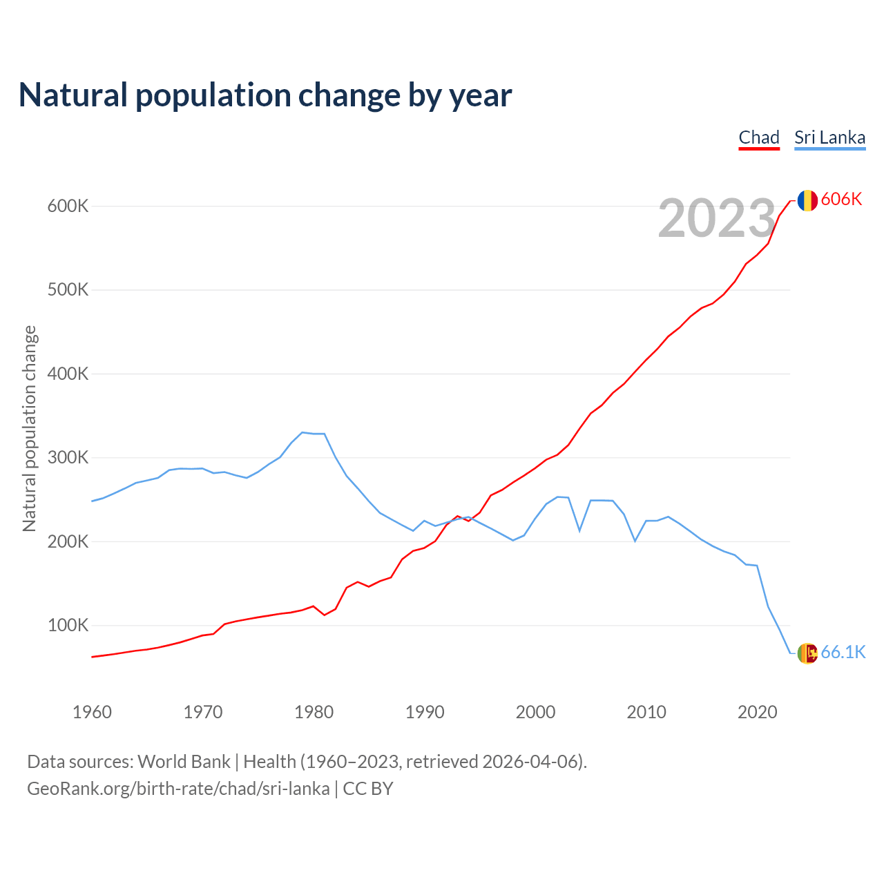 Chad has an annual birth rate of 42.4 births per 1,000 people, compared to 11.2 for Sri Lanka. The average number of children a woman is expected to have during her lifetime — the fertility rate, is 6.12 in Chad and 1.97 in Sri Lanka — 67.7% difference.