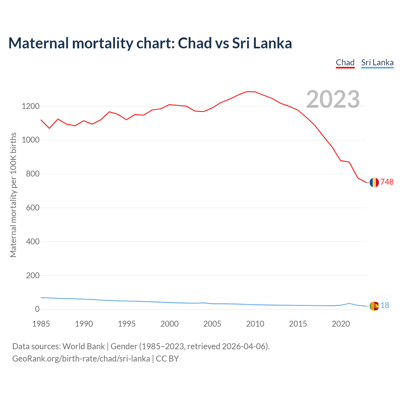 The maternal mortality rate, which is the probability of dying during childbirth or within 42 days of pregnancy termination, is 748 deaths per 100,000 live births in Chad, compared to 18 deaths in Sri Lanka.
