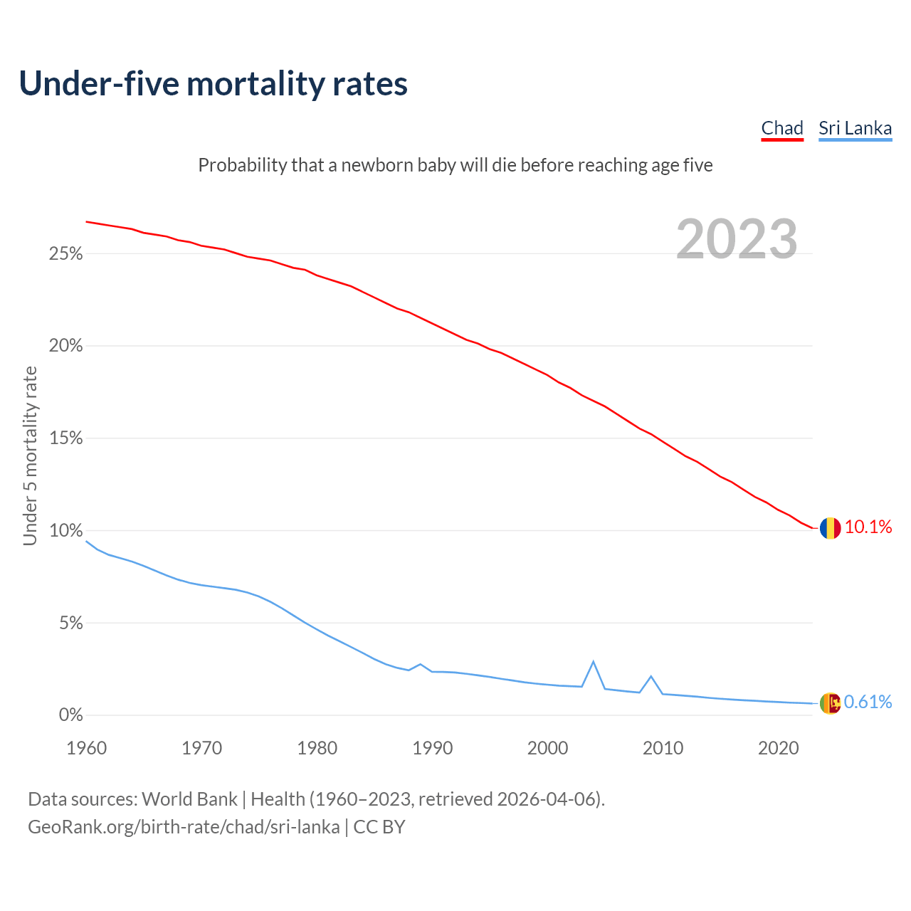 The chance that a newborn baby will die before reaching age five is 10.1% in Chad and 0.61% in Sri Lanka. Above is a chart with historical data on under-five mortality rates.