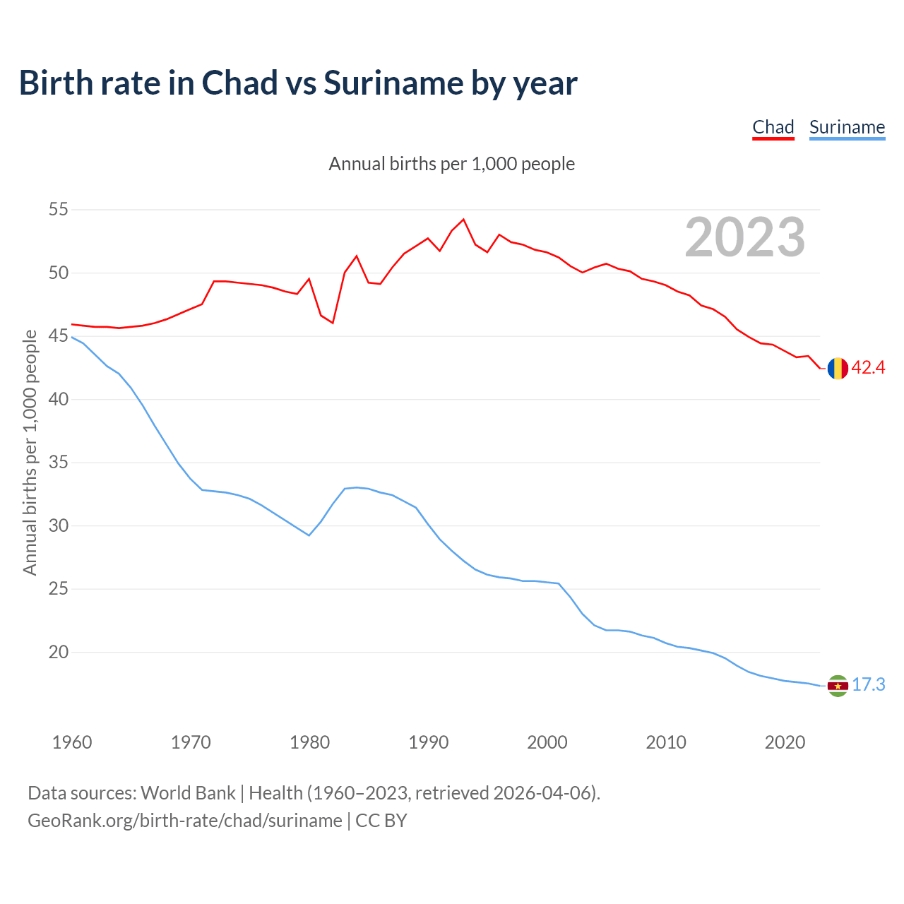 Chad has an annual birth rate of 42.4 births per 1,000 people, compared to 17.3 for Suriname. The average number of children a woman is expected to have during her lifetime — the fertility rate, is 6.12 in Chad and 2.25 in Suriname — 63.3% difference.