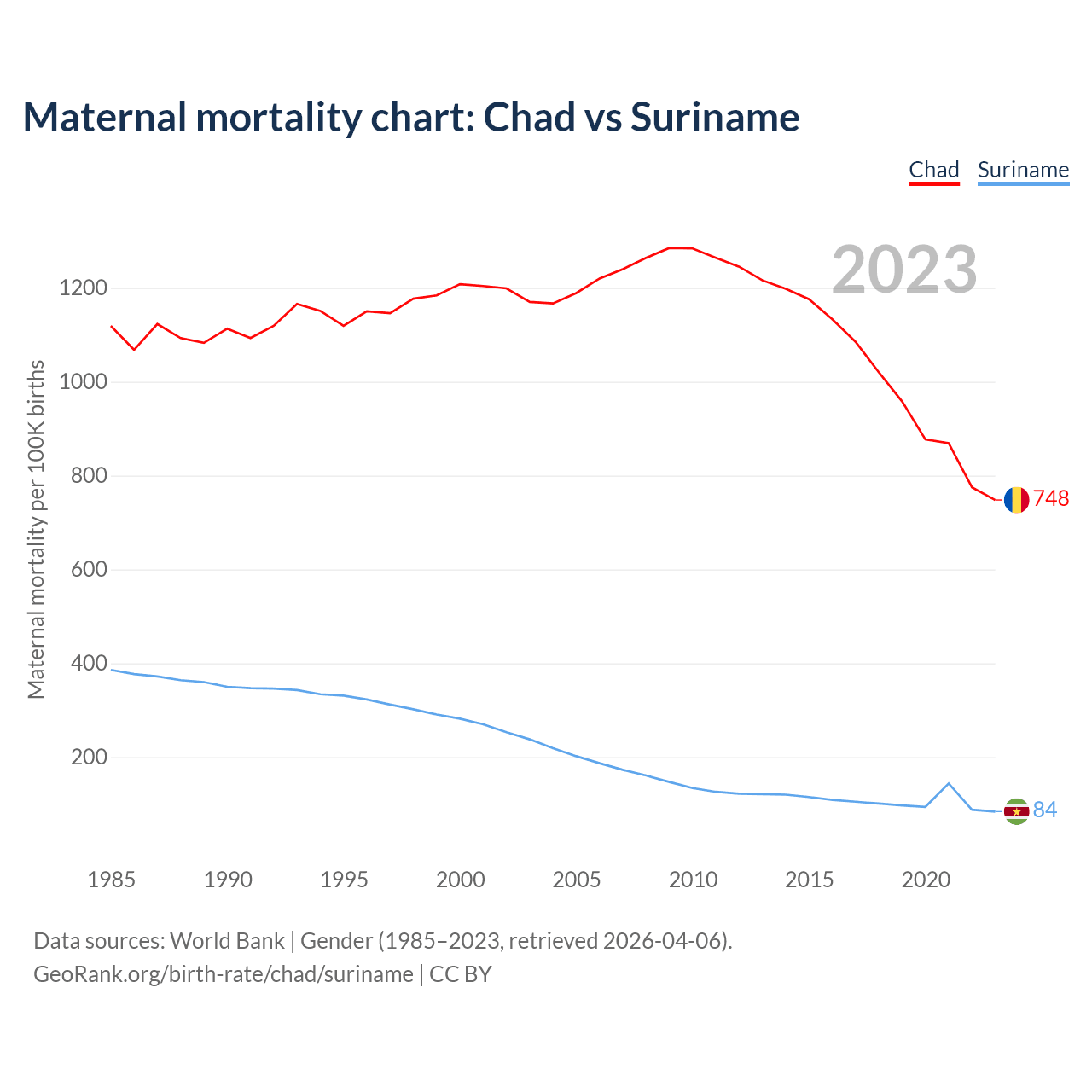 The maternal mortality rate, which is the probability of dying during childbirth or within 42 days of pregnancy termination, is 748 deaths per 100,000 live births in Chad, compared to 84 deaths in Suriname.