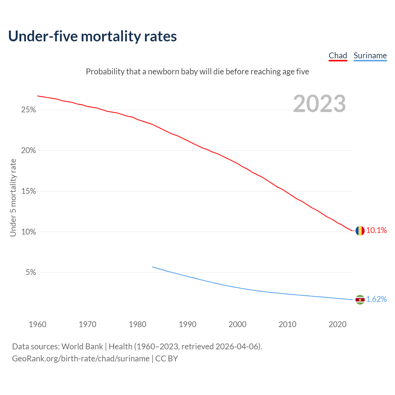 The chance that a newborn baby will die before reaching age five is 10.1% in Chad and 1.62% in Suriname. Above is a chart with historical data on under-five mortality rates.