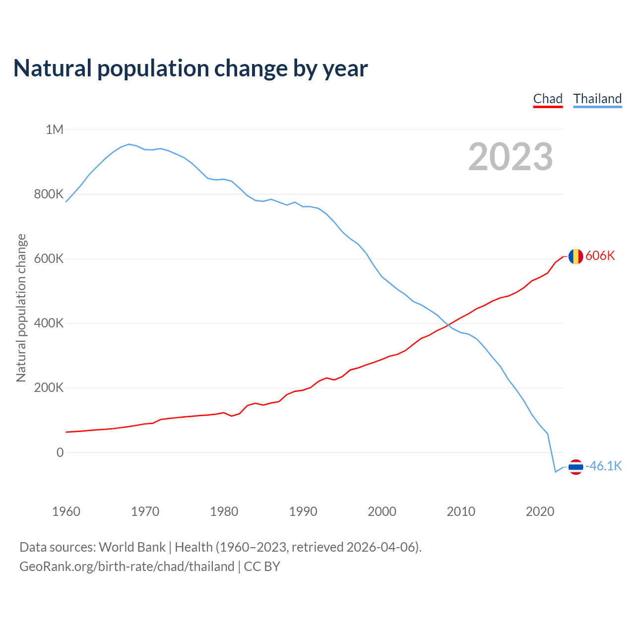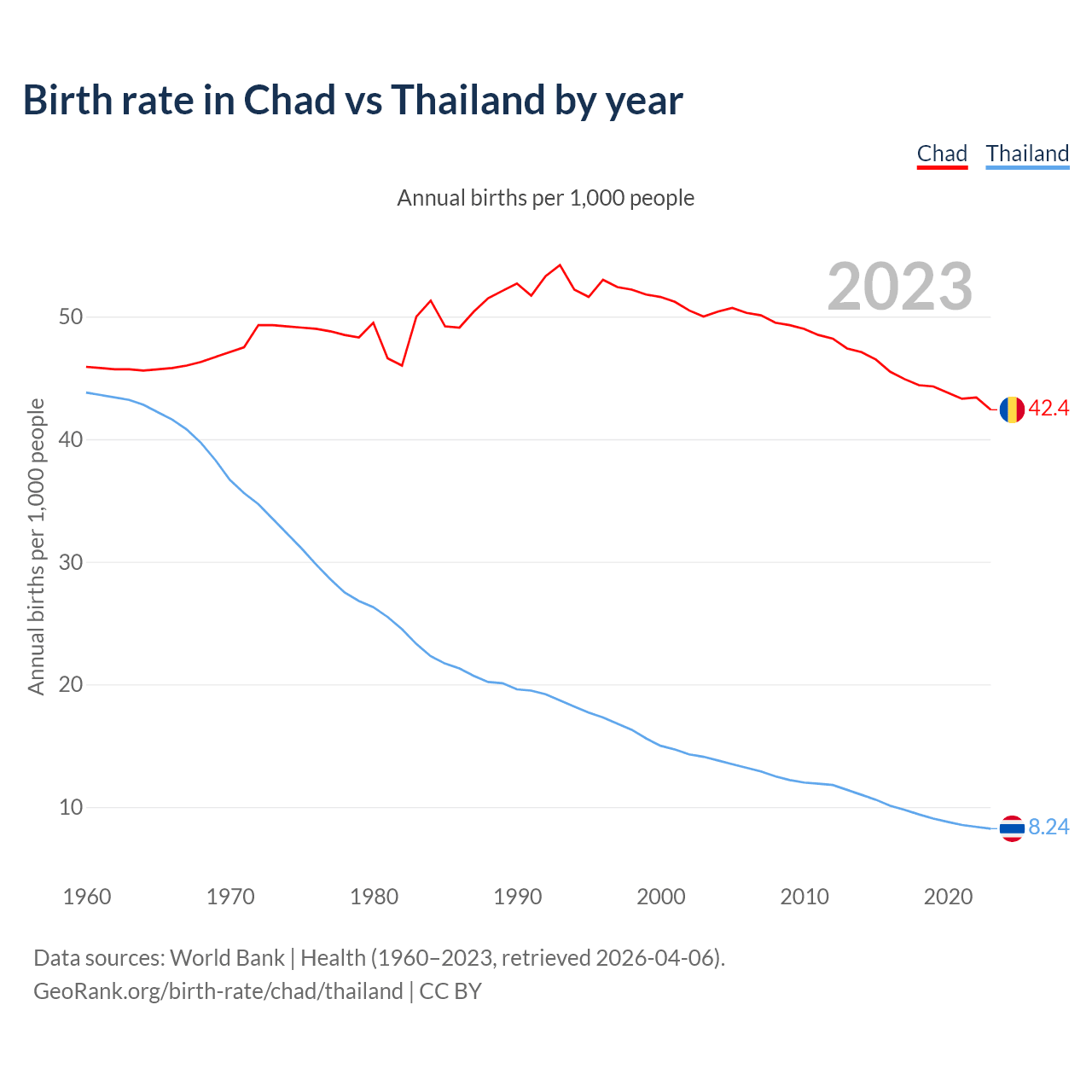 Chad has an annual birth rate of 42.4 births per 1,000 people, compared to 8.24 for Thailand. The average number of children a woman is expected to have during her lifetime — the fertility rate, is 6.12 in Chad and 1.21 in Thailand — 80.2% difference.