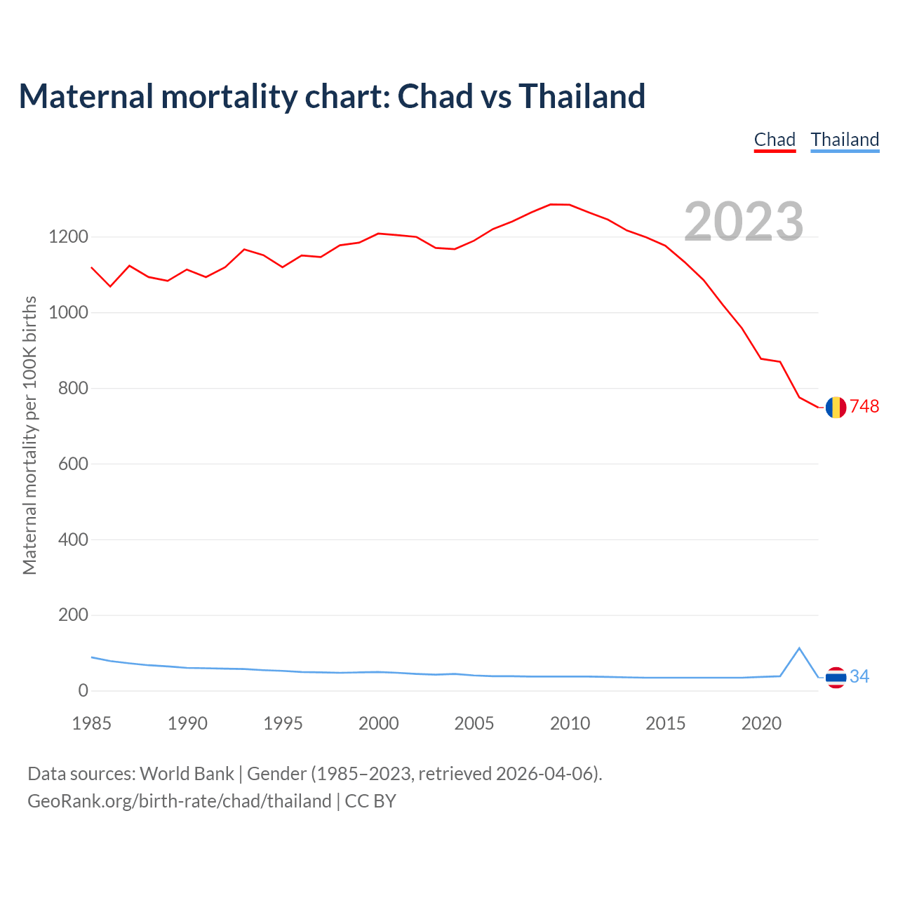 The maternal mortality rate, which is the probability of dying during childbirth or within 42 days of pregnancy termination, is 748 deaths per 100,000 live births in Chad, compared to 34 deaths in Thailand.