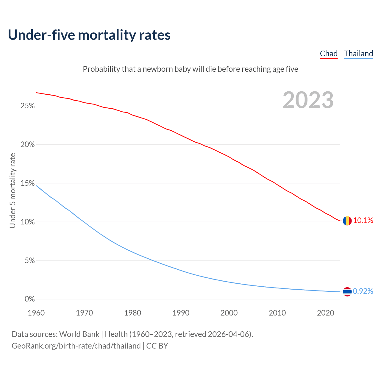 The chance that a newborn baby will die before reaching age five is 10.1% in Chad and 0.92% in Thailand. Above is a chart with historical data on under-five mortality rates.