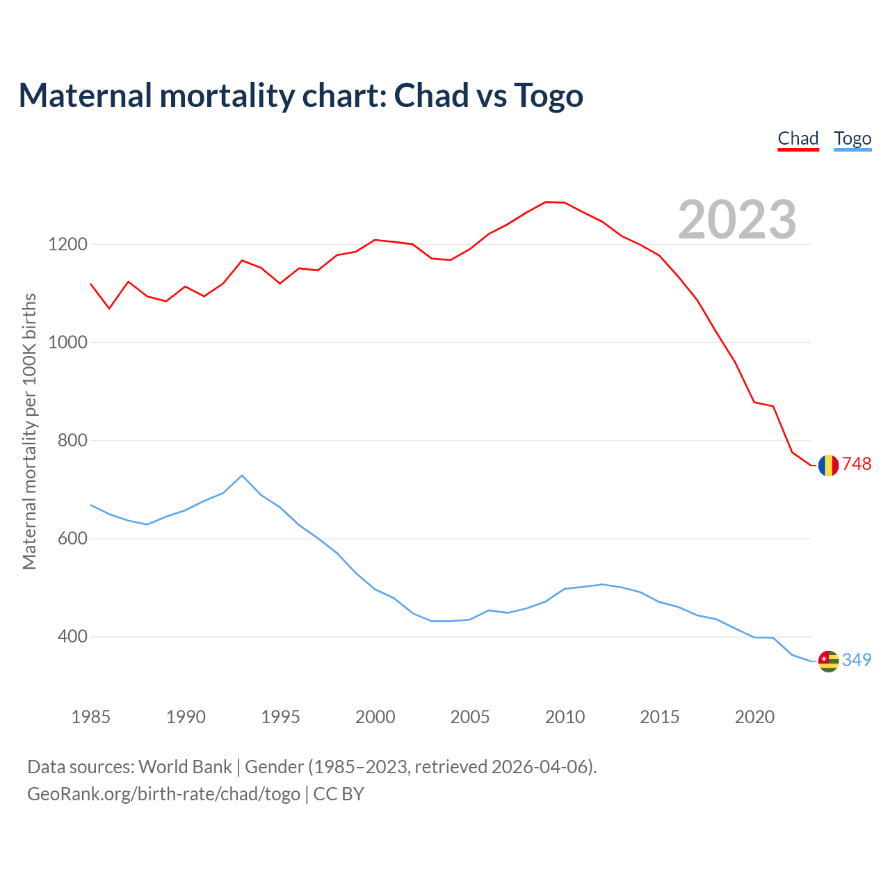 The maternal mortality rate, which is the probability of dying during childbirth or within 42 days of pregnancy termination, is 748 deaths per 100,000 live births in Chad, compared to 349 deaths in Togo.