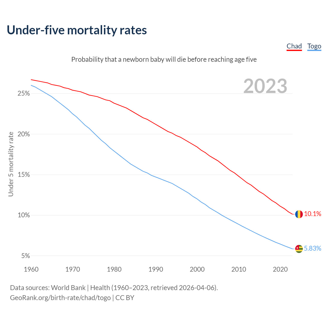 The chance that a newborn baby will die before reaching age five is 10.1% in Chad and 5.83% in Togo. Above is a chart with historical data on under-five mortality rates.