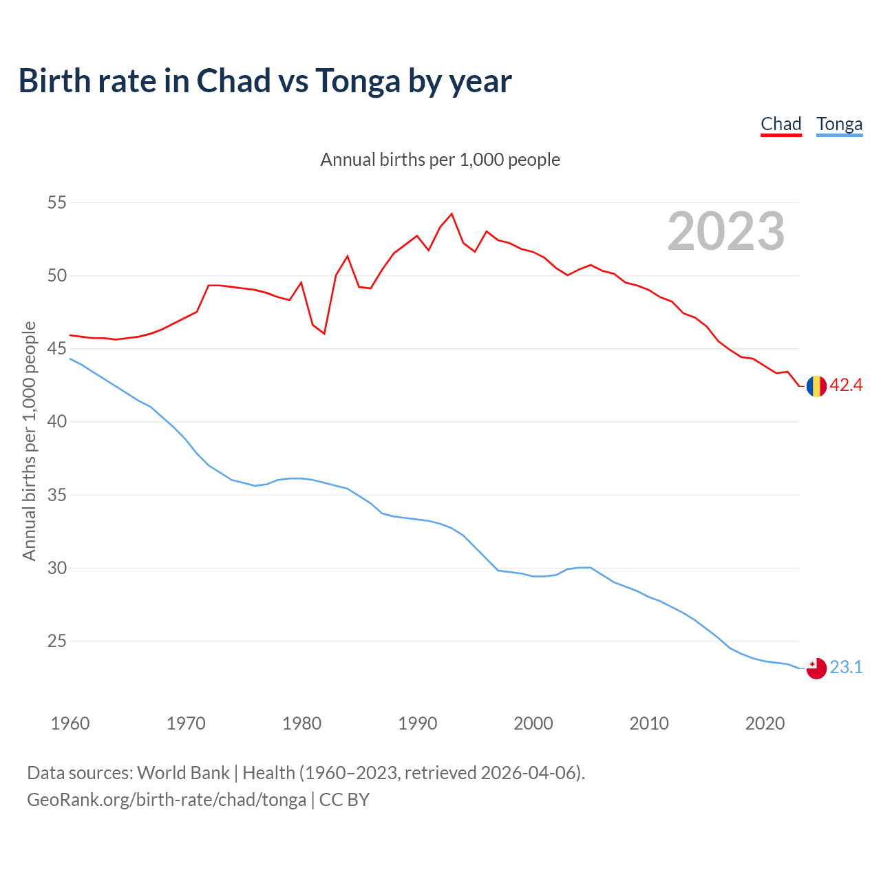 Chad has an annual birth rate of 42.4 births per 1,000 people, compared to 23.1 for Tonga. The average number of children a woman is expected to have during her lifetime — the fertility rate, is 6.12 in Chad and 3.13 in Tonga — 48.9% difference.
