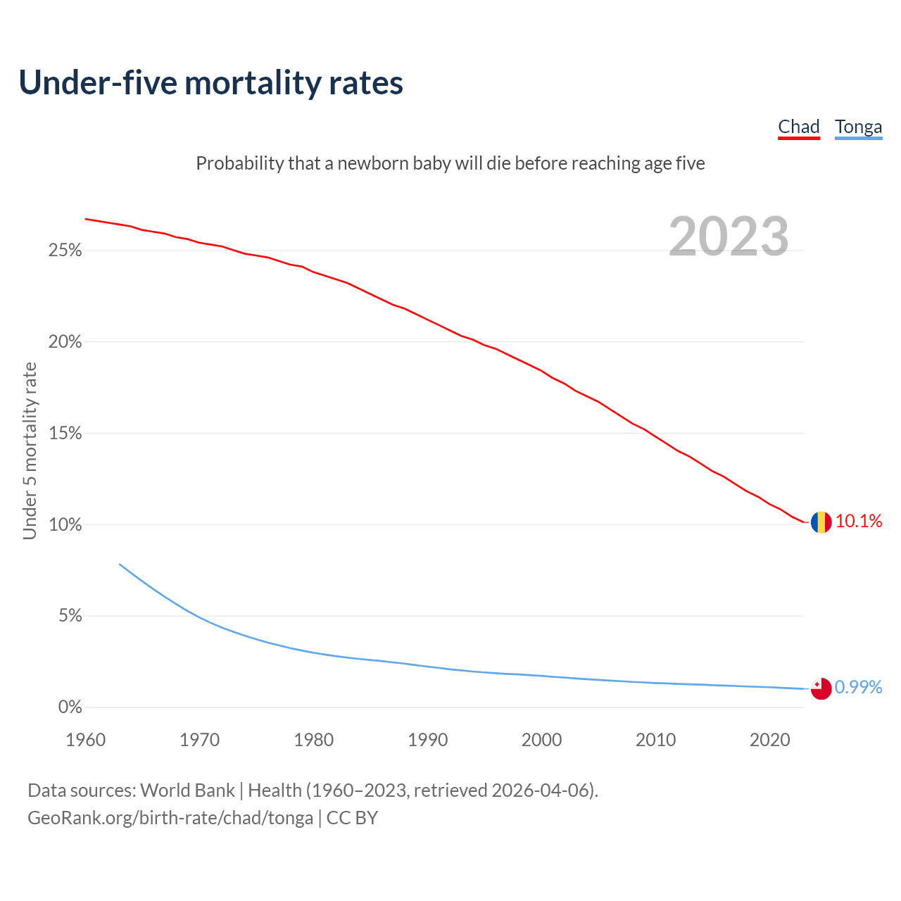 The chance that a newborn baby will die before reaching age five is 10.1% in Chad and 0.99% in Tonga. Above is a chart with historical data on under-five mortality rates.