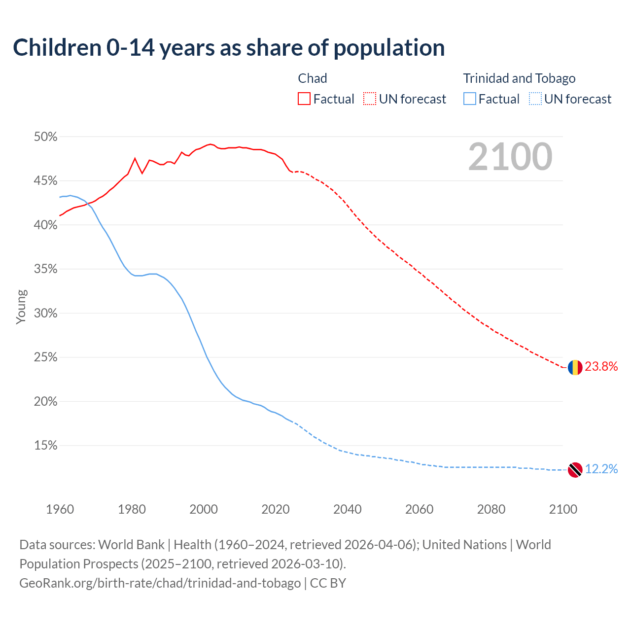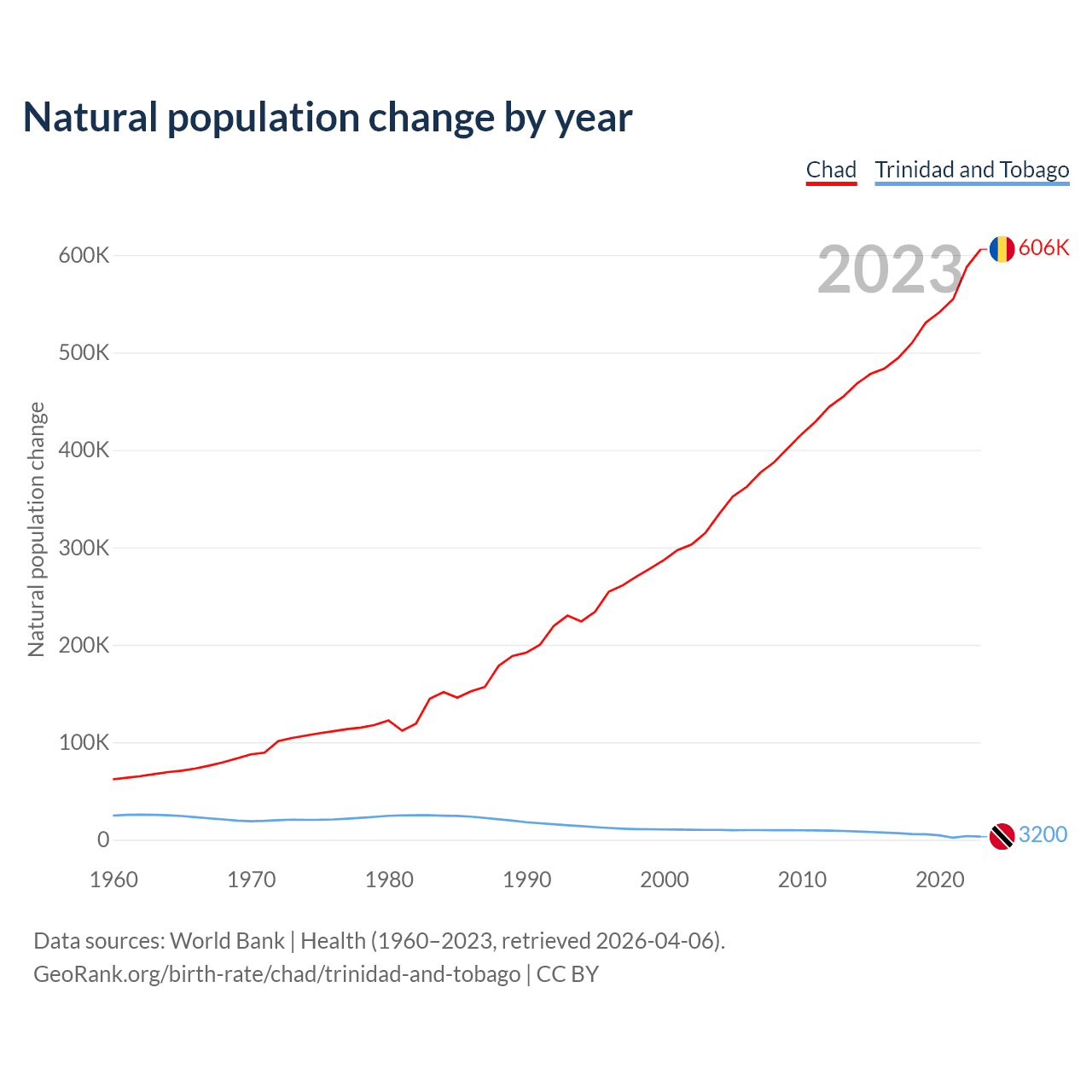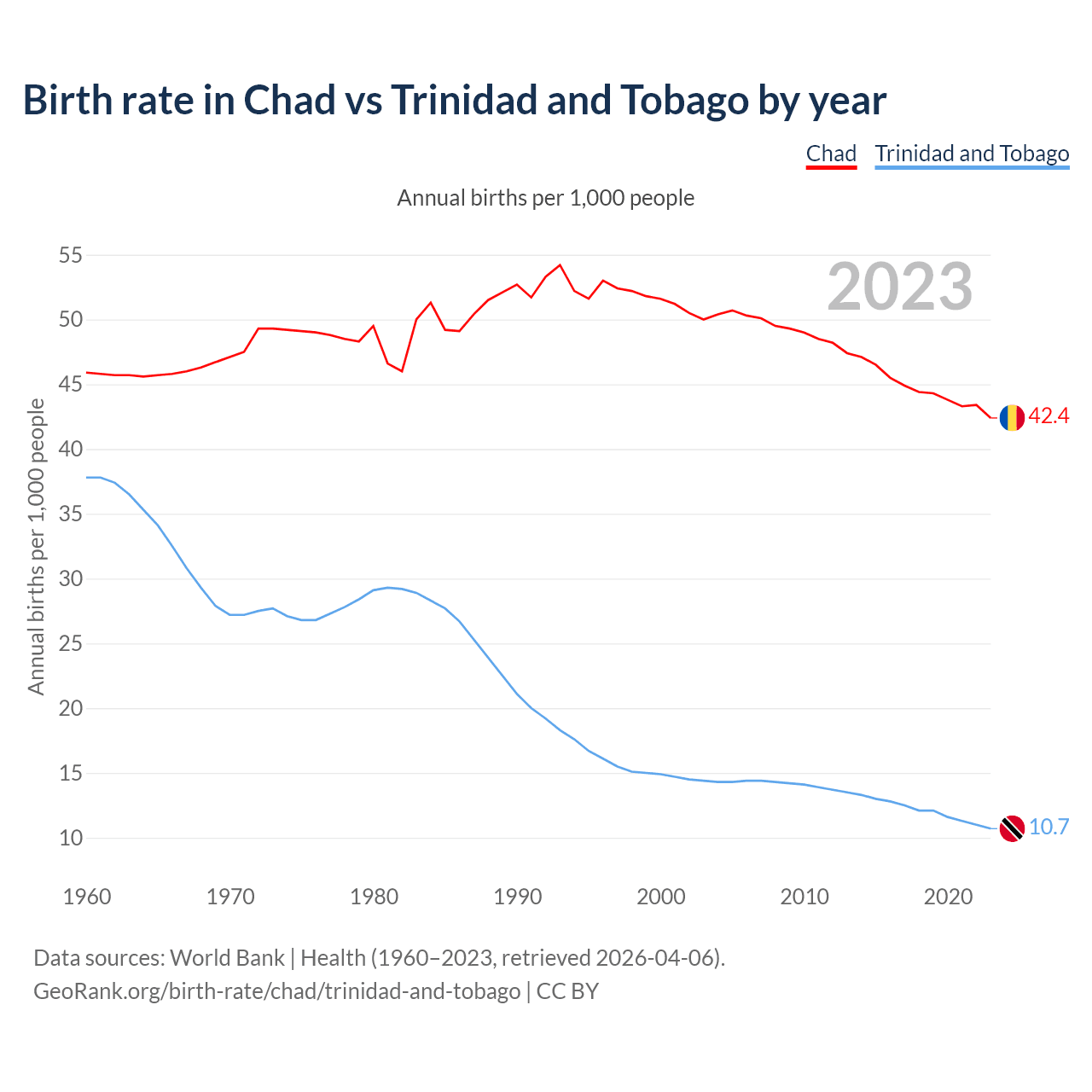 Chad has an annual birth rate of 42.4 births per 1,000 people, compared to 10.7 for Trinidad and Tobago. The average number of children a woman is expected to have during her lifetime — the fertility rate, is 6.12 in Chad and 1.53 in Trinidad and Tobago — 75% difference.