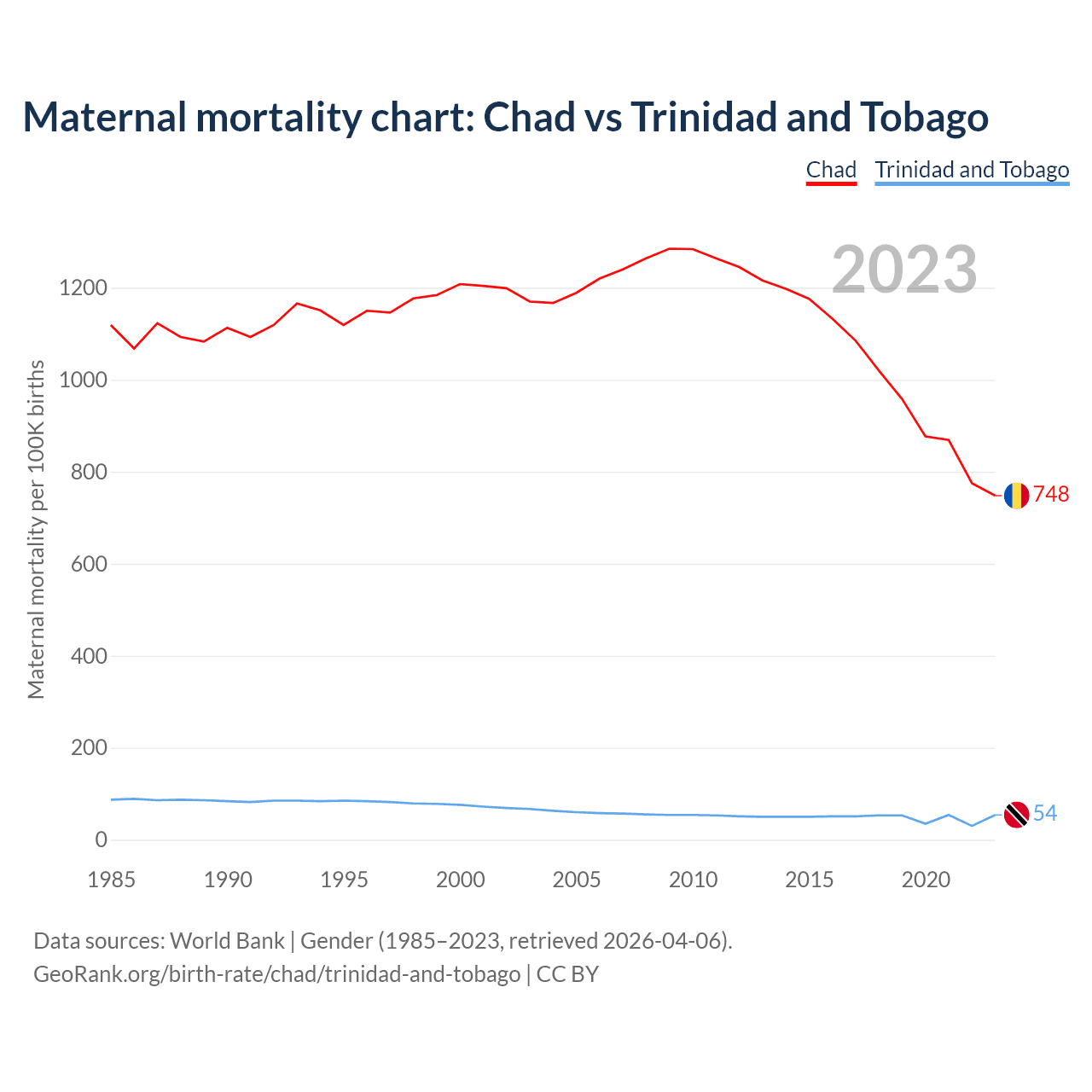 The maternal mortality rate, which is the probability of dying during childbirth or within 42 days of pregnancy termination, is 748 deaths per 100,000 live births in Chad, compared to 54 deaths in Trinidad and Tobago.