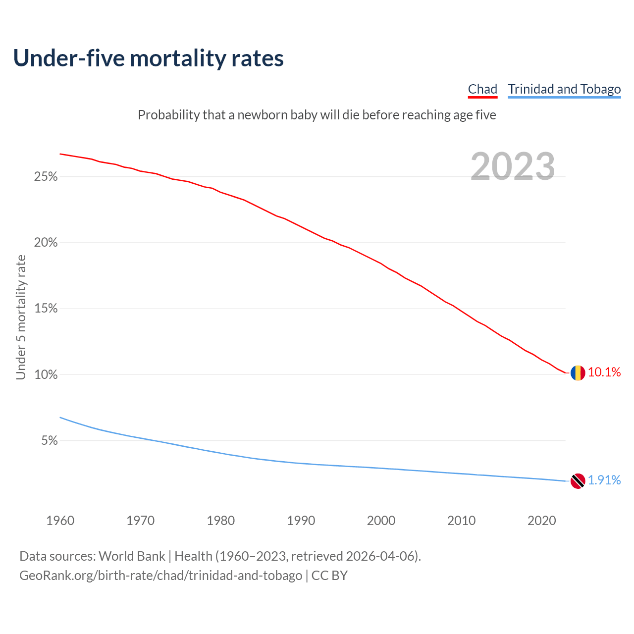 The chance that a newborn baby will die before reaching age five is 10.1% in Chad and 1.91% in Trinidad and Tobago. Above is a chart with historical data on under-five mortality rates.