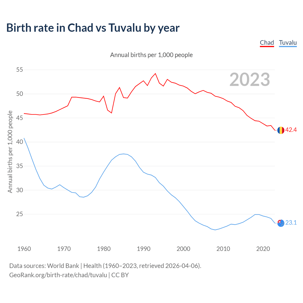Chad has an annual birth rate of 42.4 births per 1,000 people, compared to 23.1 for Tuvalu. The average number of children a woman is expected to have during her lifetime — the fertility rate, is 6.12 in Chad and 3.21 in Tuvalu — 47.6% difference.