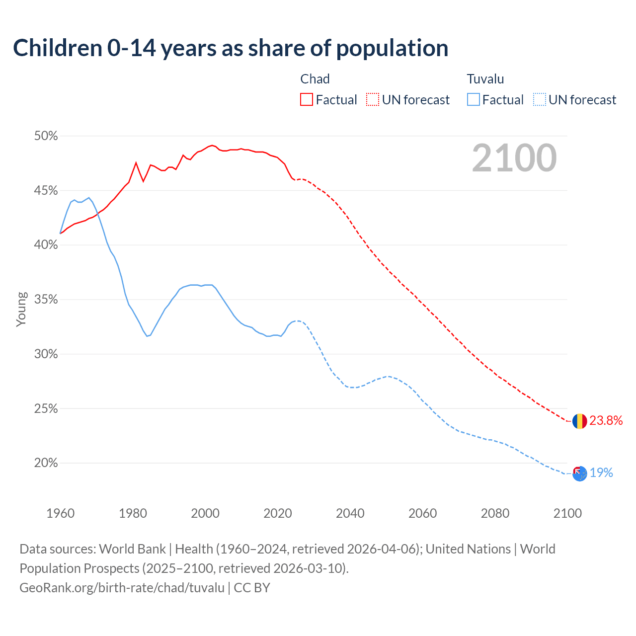 According to the latest available data on birth rates, the fertility rate in Chad was 6.12 children per woman in 2023, compared to 3.21 in Tuvalu in 2023. The replacement level is considered to be 2.1 children per woman.