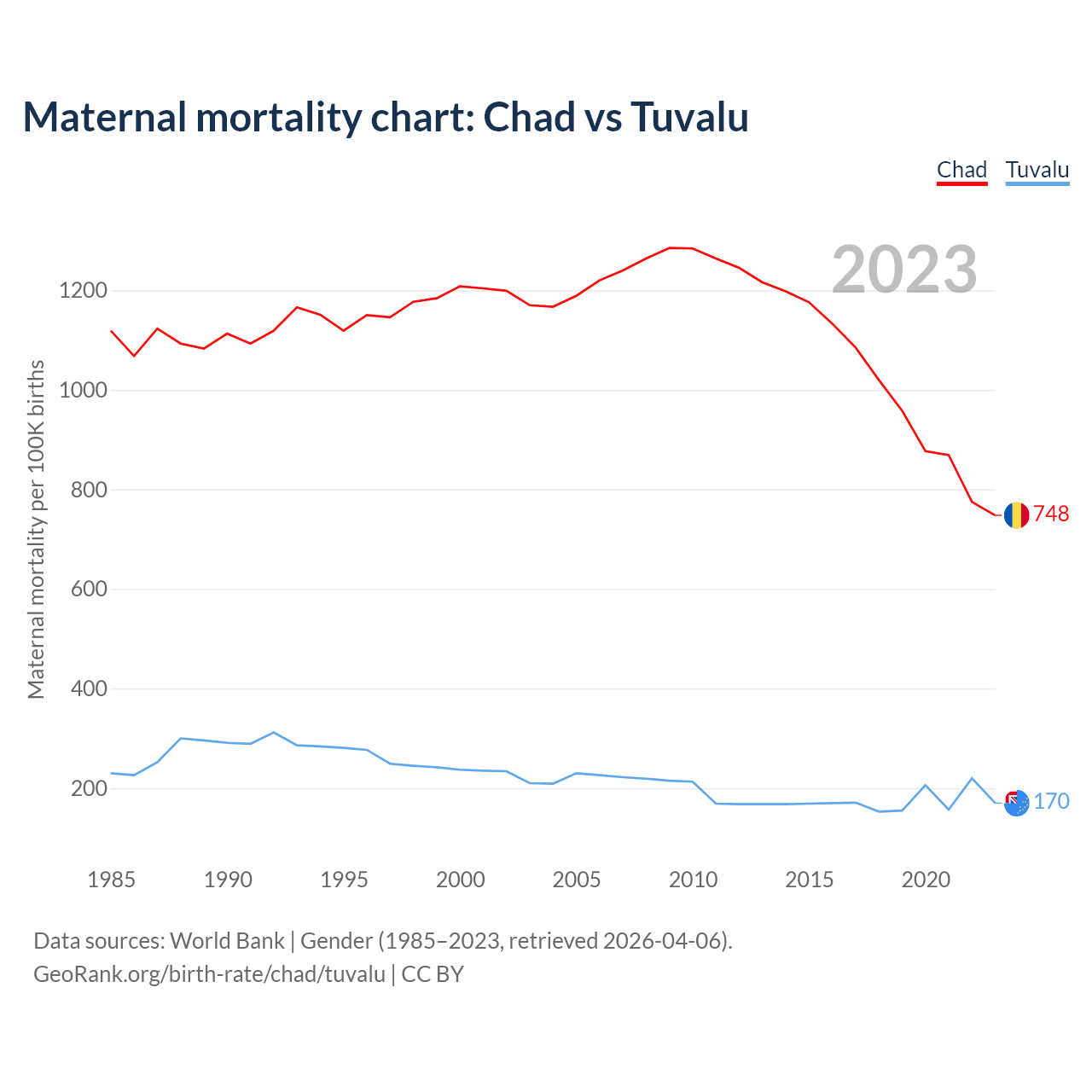 The maternal mortality rate, which is the probability of dying during childbirth or within 42 days of pregnancy termination, is 748 deaths per 100,000 live births in Chad, compared to 170 deaths in Tuvalu.