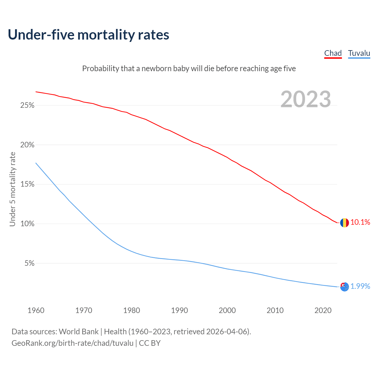 The chance that a newborn baby will die before reaching age five is 10.1% in Chad and 1.99% in Tuvalu. Above is a chart with historical data on under-five mortality rates.