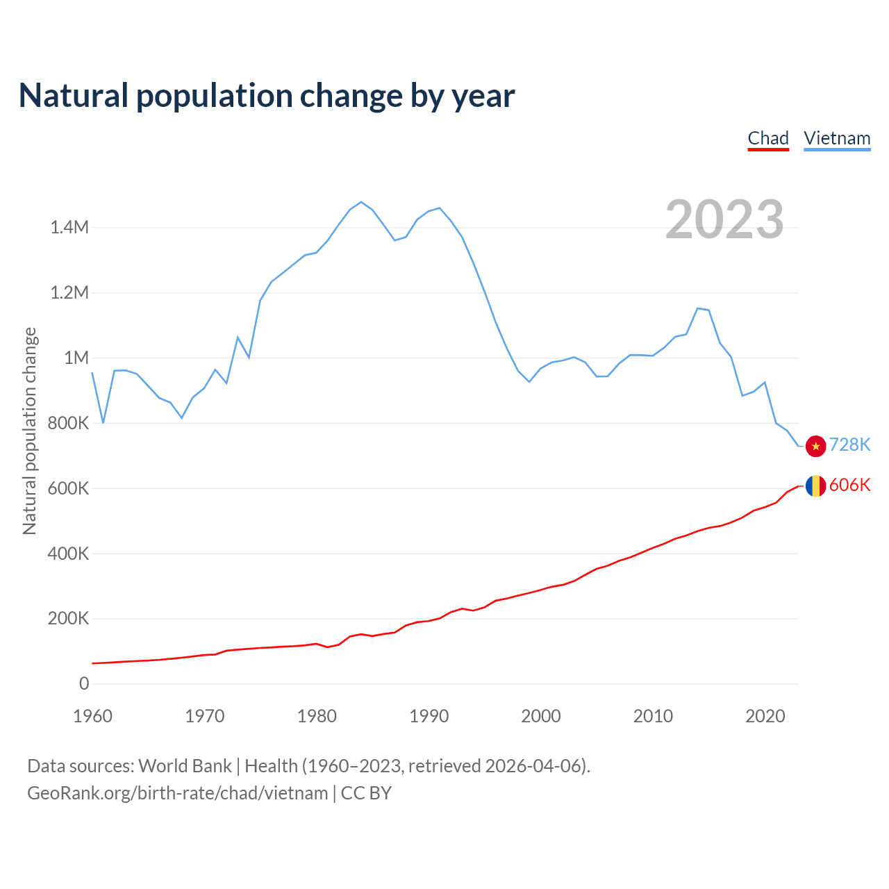 Chad has an annual birth rate of 42.4 births per 1,000 people, compared to 13.8 for Vietnam. The average number of children a woman is expected to have during her lifetime — the fertility rate, is 6.12 in Chad and 1.91 in Vietnam — 68.7% difference.