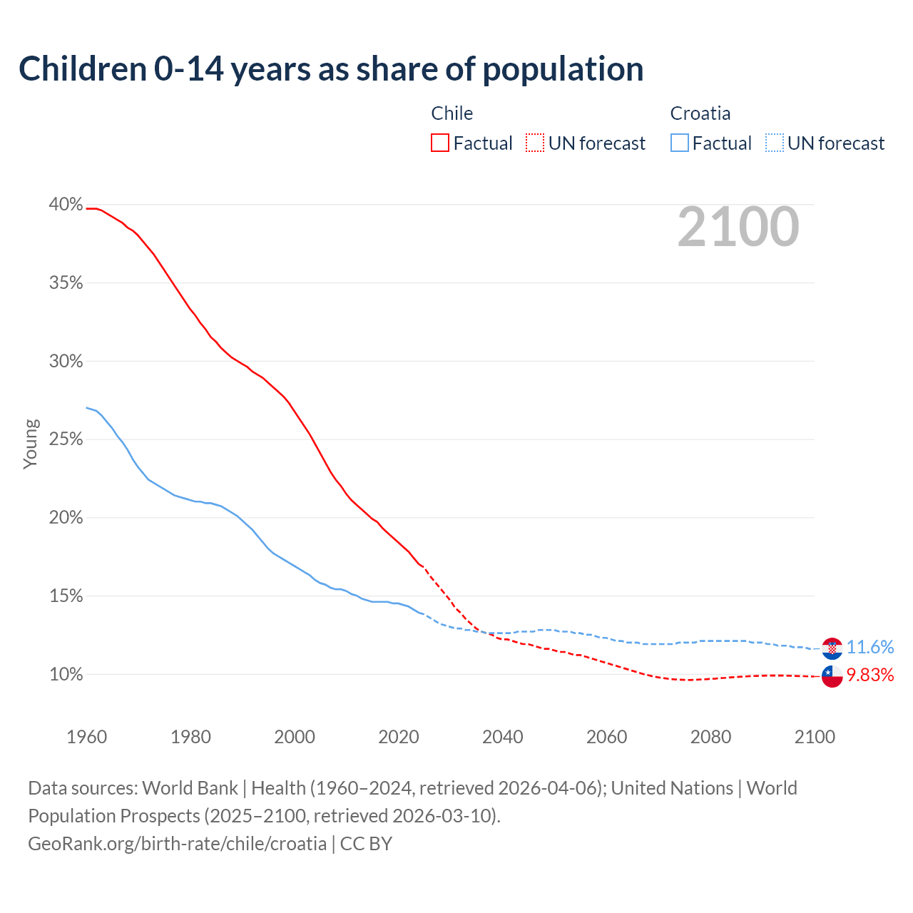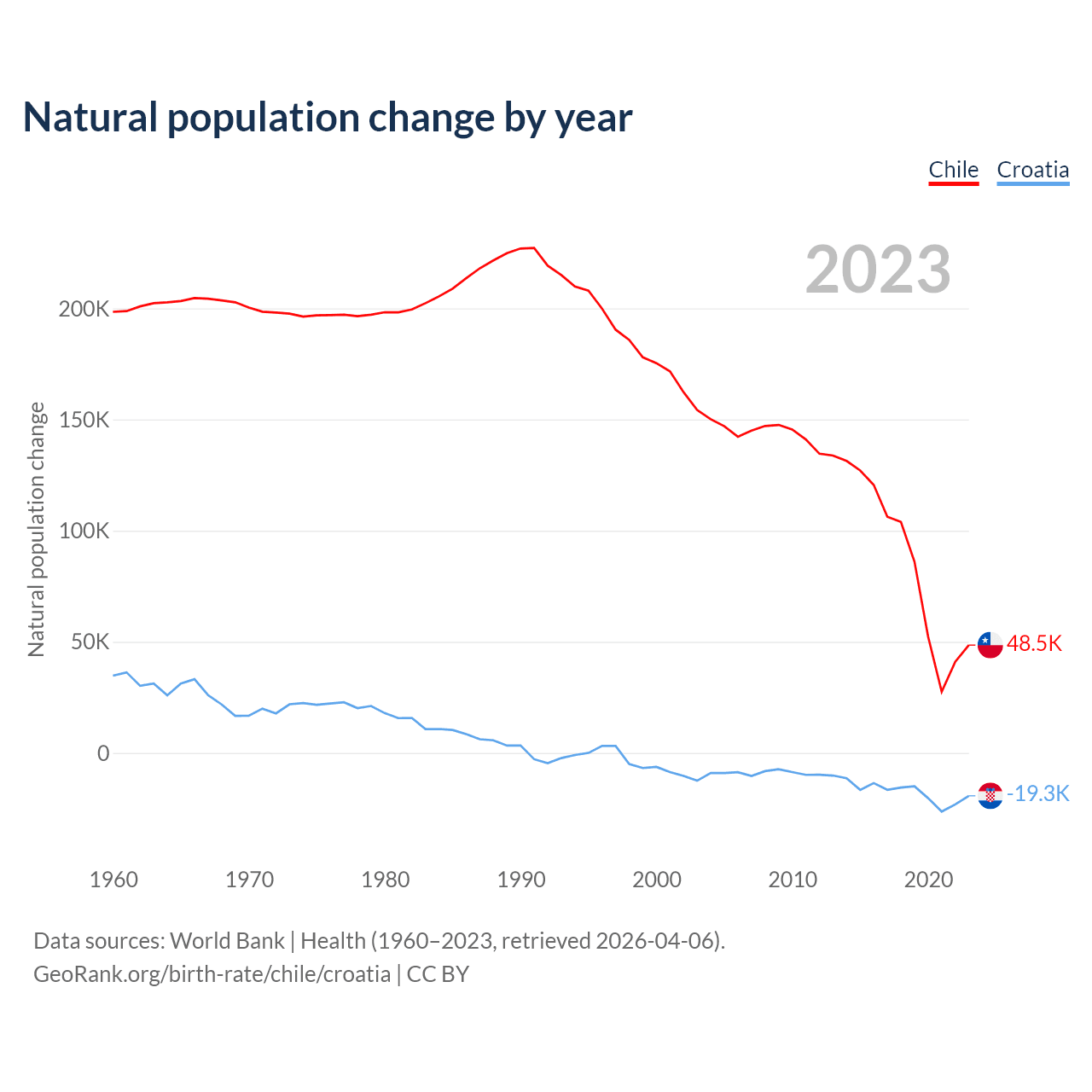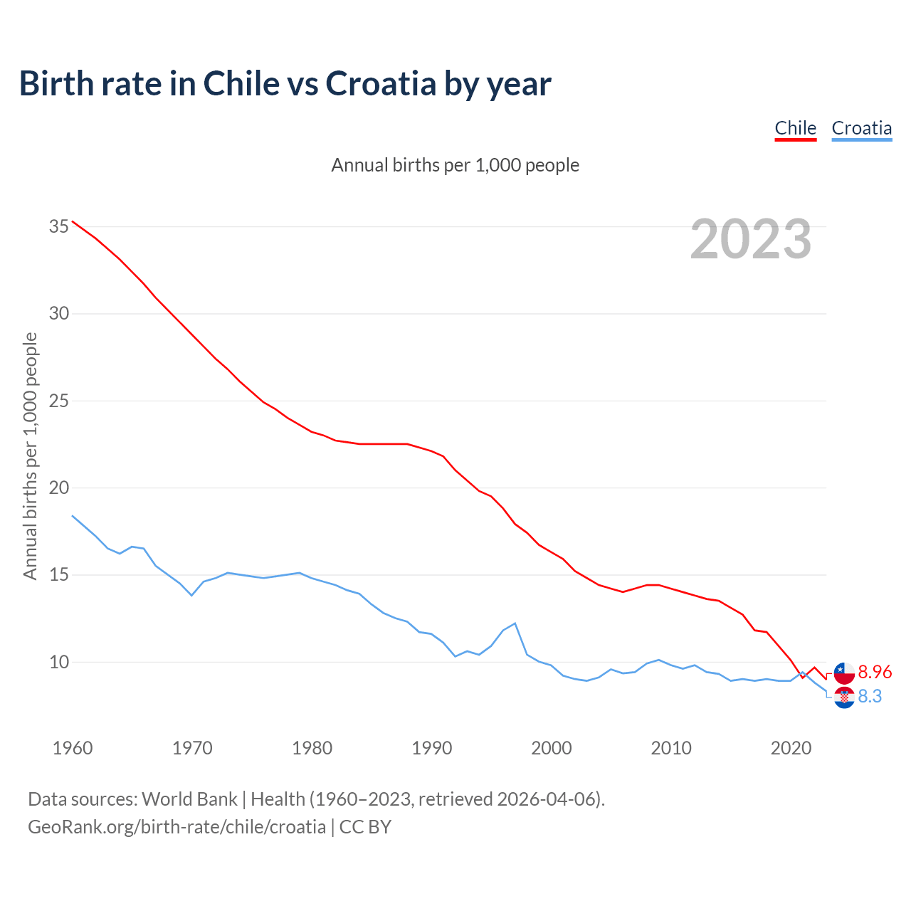 According to the latest available data on birth rates, the fertility rate in Chile was 1.17 children per woman in 2023, compared to 1.46 in Croatia in 2023. The replacement level is considered to be 2.1 children per woman.