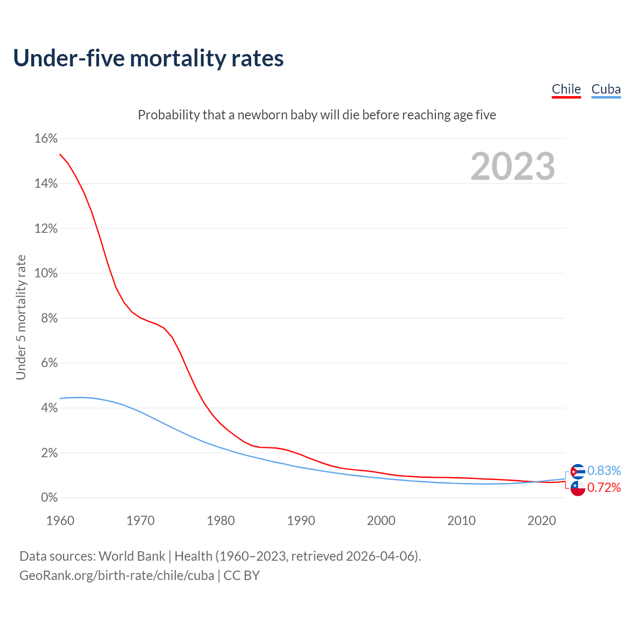 The chance that a newborn baby will die before reaching age five is 0.72% in Chile and 0.83% in Cuba. Above is a chart with historical data on under-five mortality rates.
