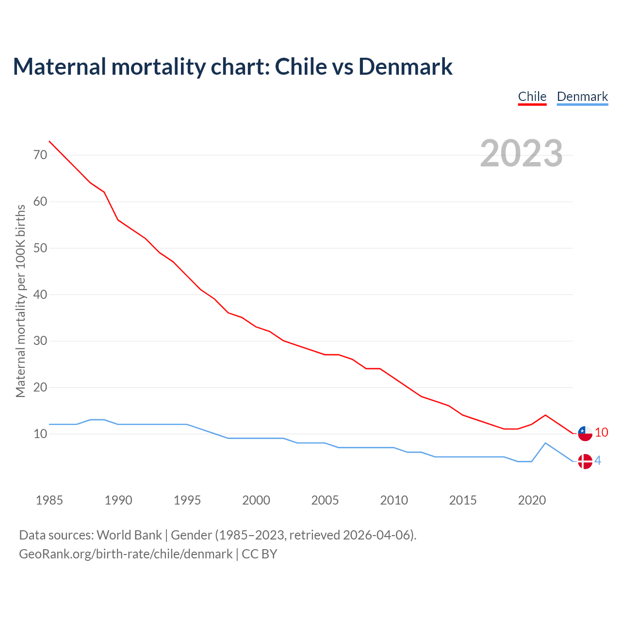 The maternal mortality rate, which is the probability of dying during childbirth or within 42 days of pregnancy termination, is 10 deaths per 100,000 live births in Chile, compared to 4 deaths in Denmark.