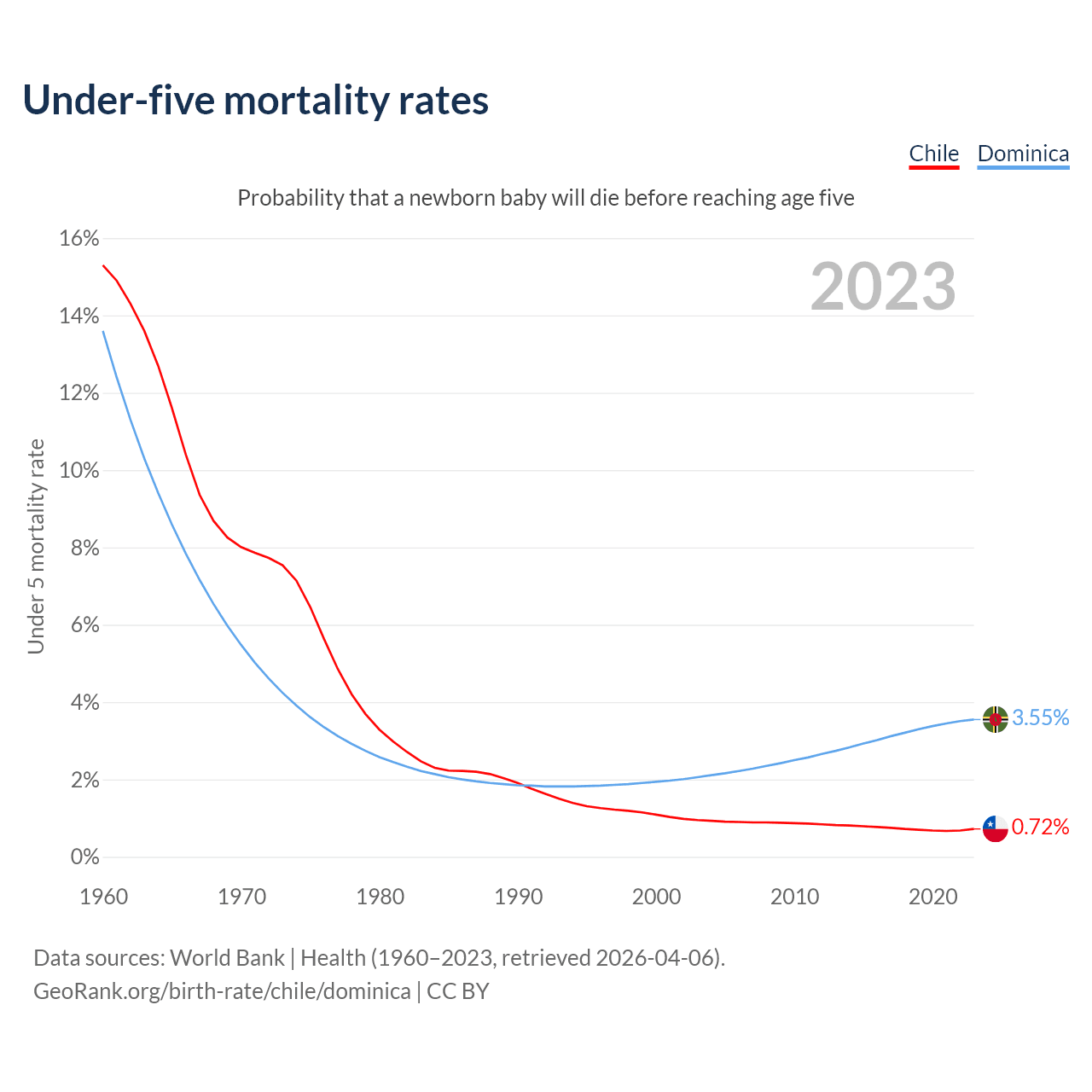 The chance that a newborn baby will die before reaching age five is 0.72% in Chile and 3.55% in Dominica. Above is a chart with historical data on under-five mortality rates.