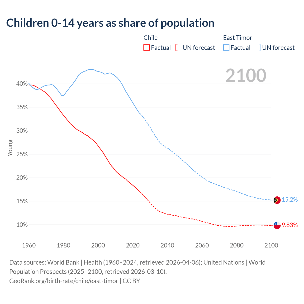 Chile has an annual birth rate of 8.96 births per 1,000 people, compared to 22.1 for East Timor. The average number of children a woman is expected to have during her lifetime — the fertility rate, is 1.17 in Chile and 2.71 in East Timor — 132% difference.