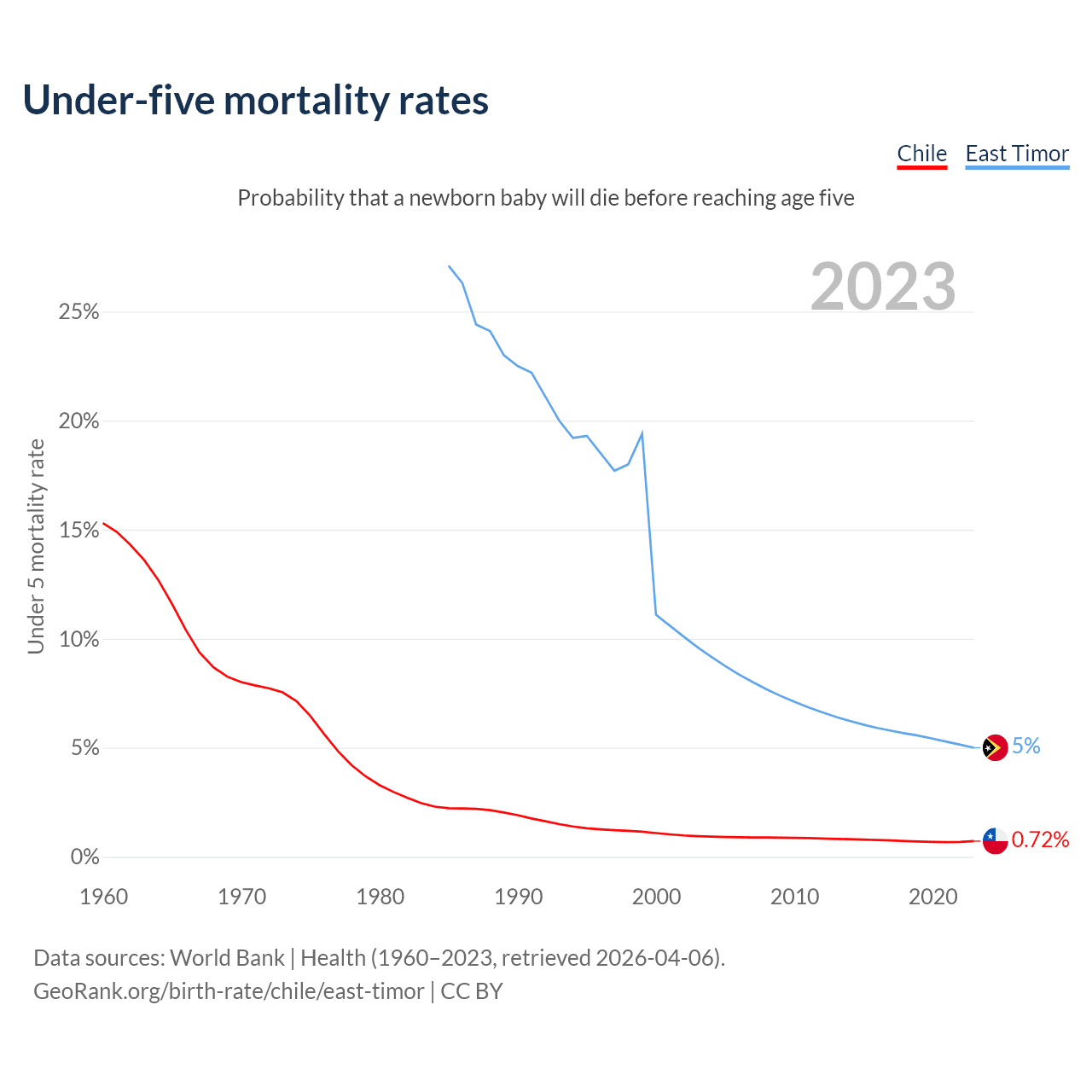 The chance that a newborn baby will die before reaching age five is 0.72% in Chile and 5% in East Timor. Above is a chart with historical data on under-five mortality rates.