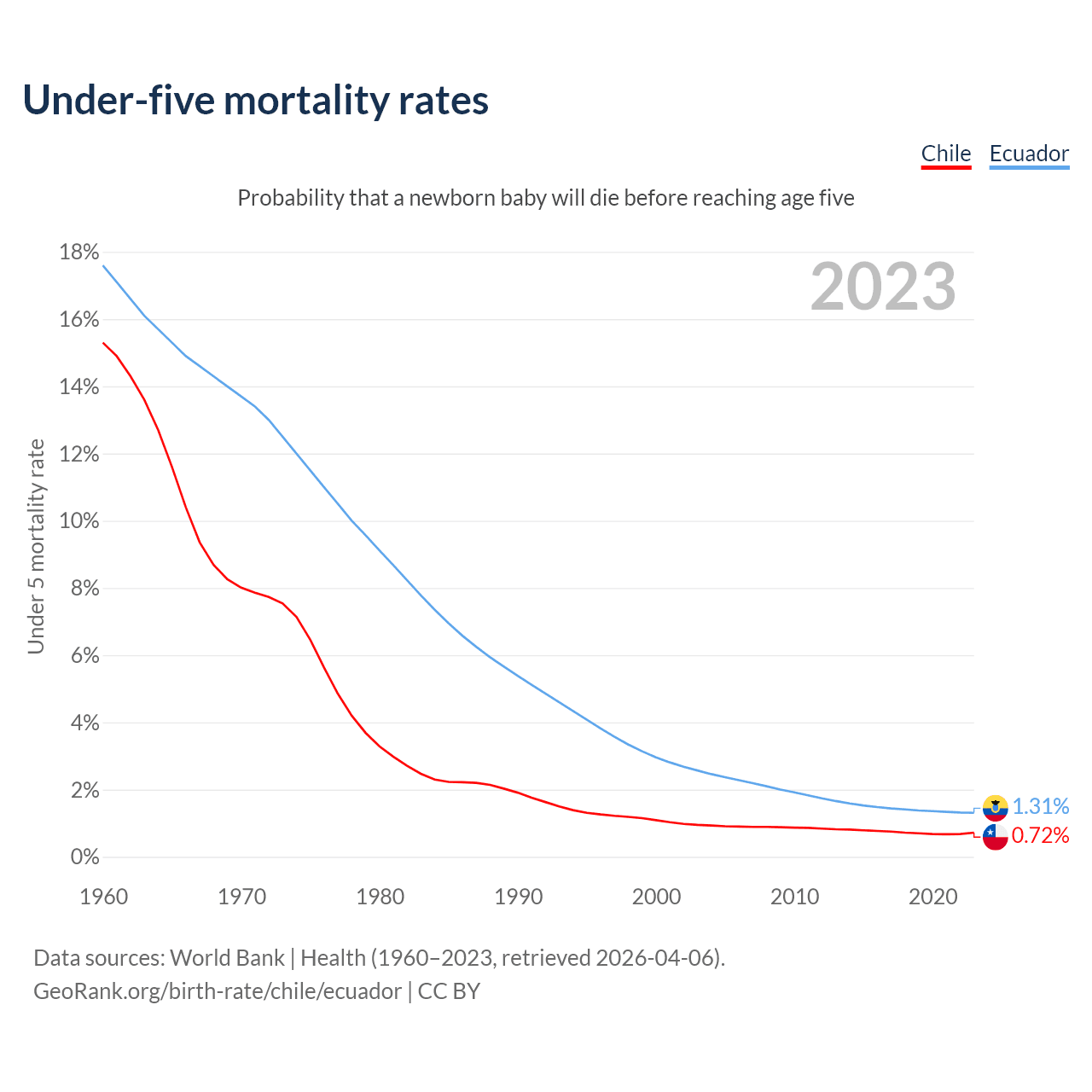 The chance that a newborn baby will die before reaching age five is 0.72% in Chile and 1.31% in Ecuador. Above is a chart with historical data on under-five mortality rates.