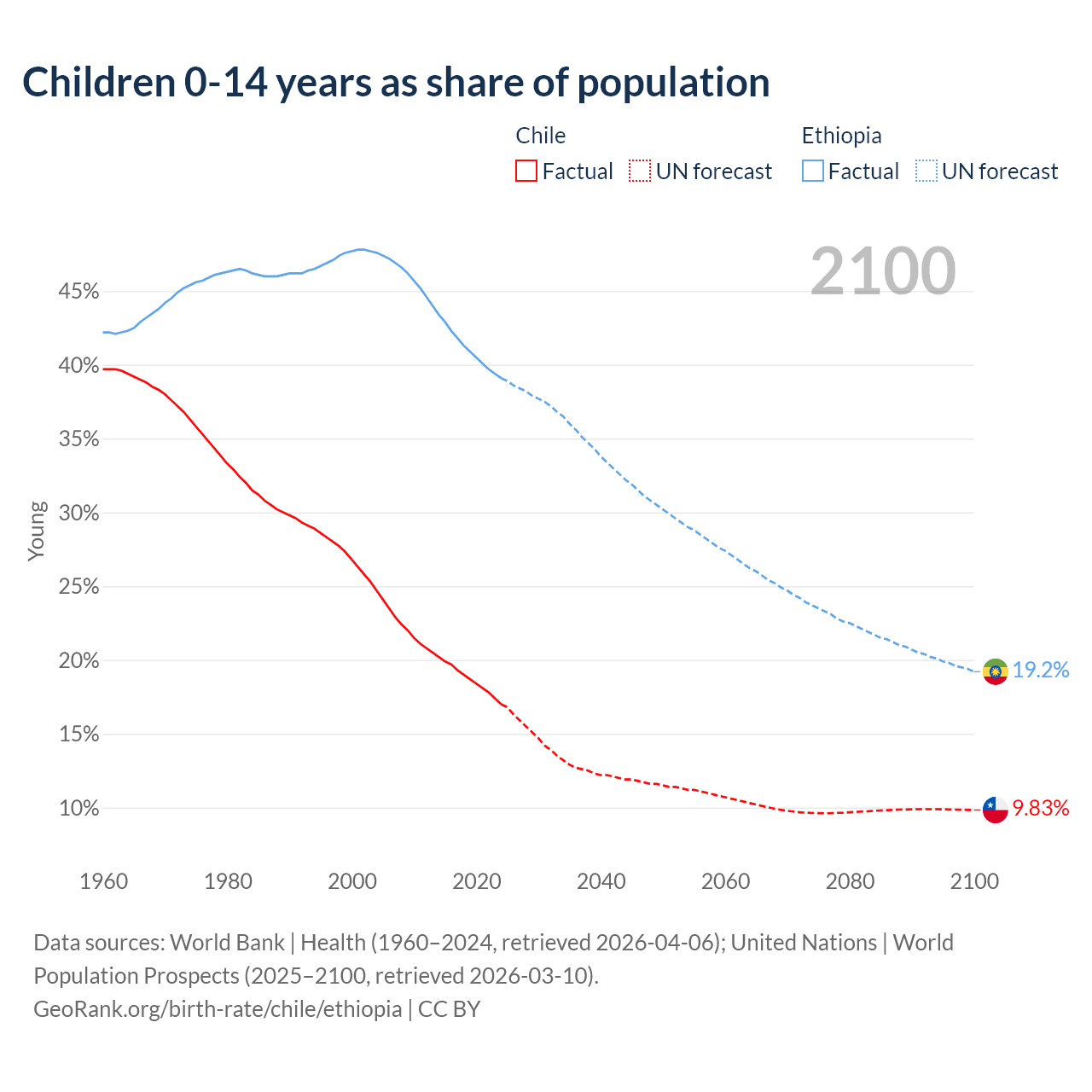According to the latest available data on birth rates, the fertility rate in Chile was 1.17 children per woman in 2023, compared to 3.99 in Ethiopia in 2023. The replacement level is considered to be 2.1 children per woman.