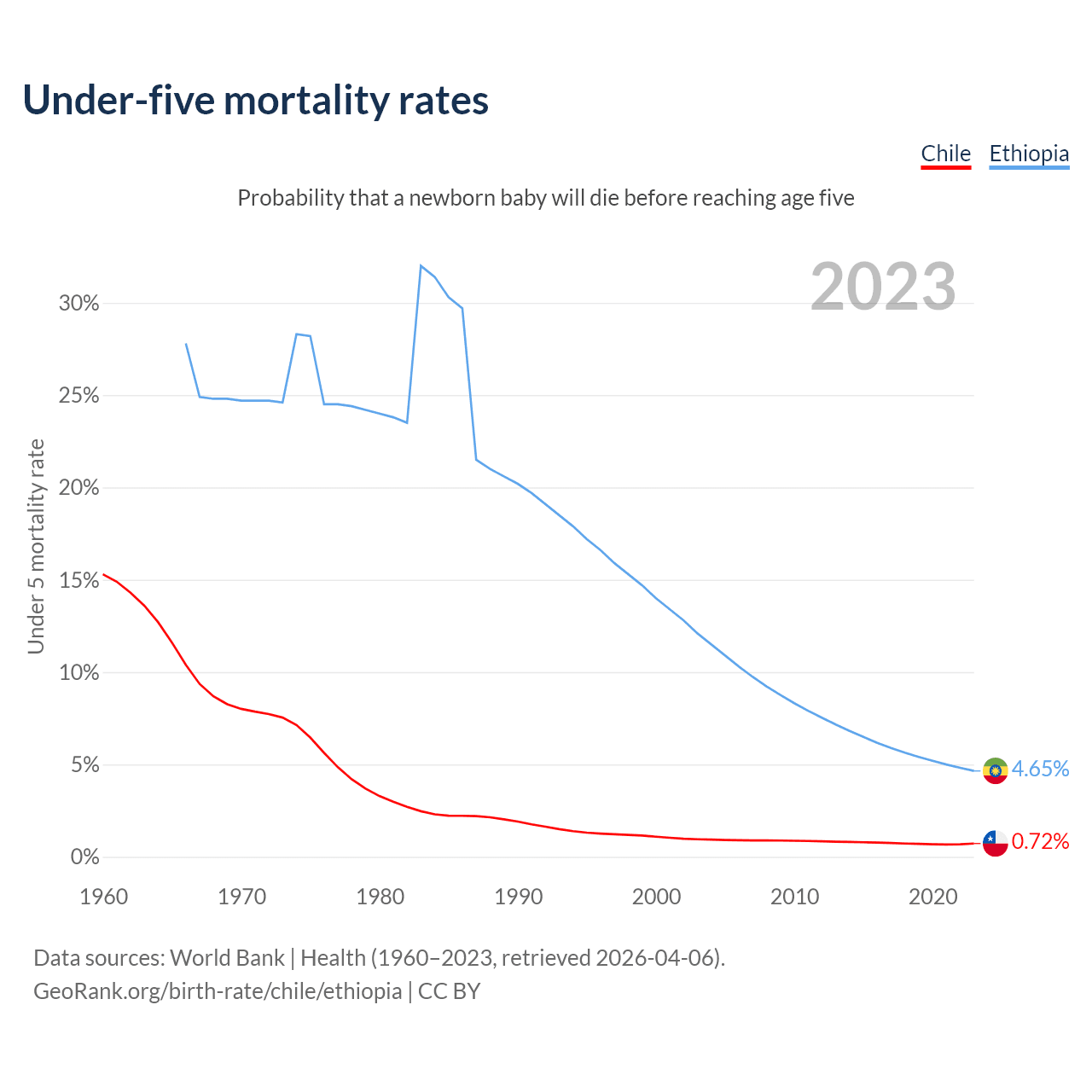 The chance that a newborn baby will die before reaching age five is 0.72% in Chile and 4.65% in Ethiopia. Above is a chart with historical data on under-five mortality rates.