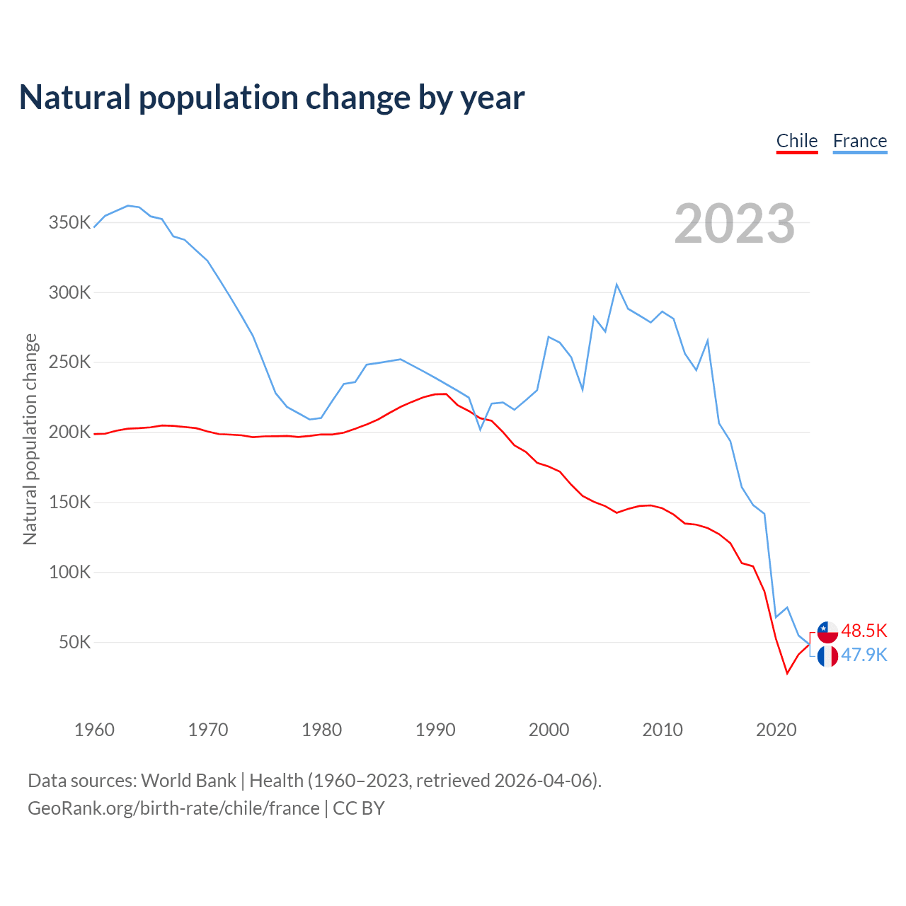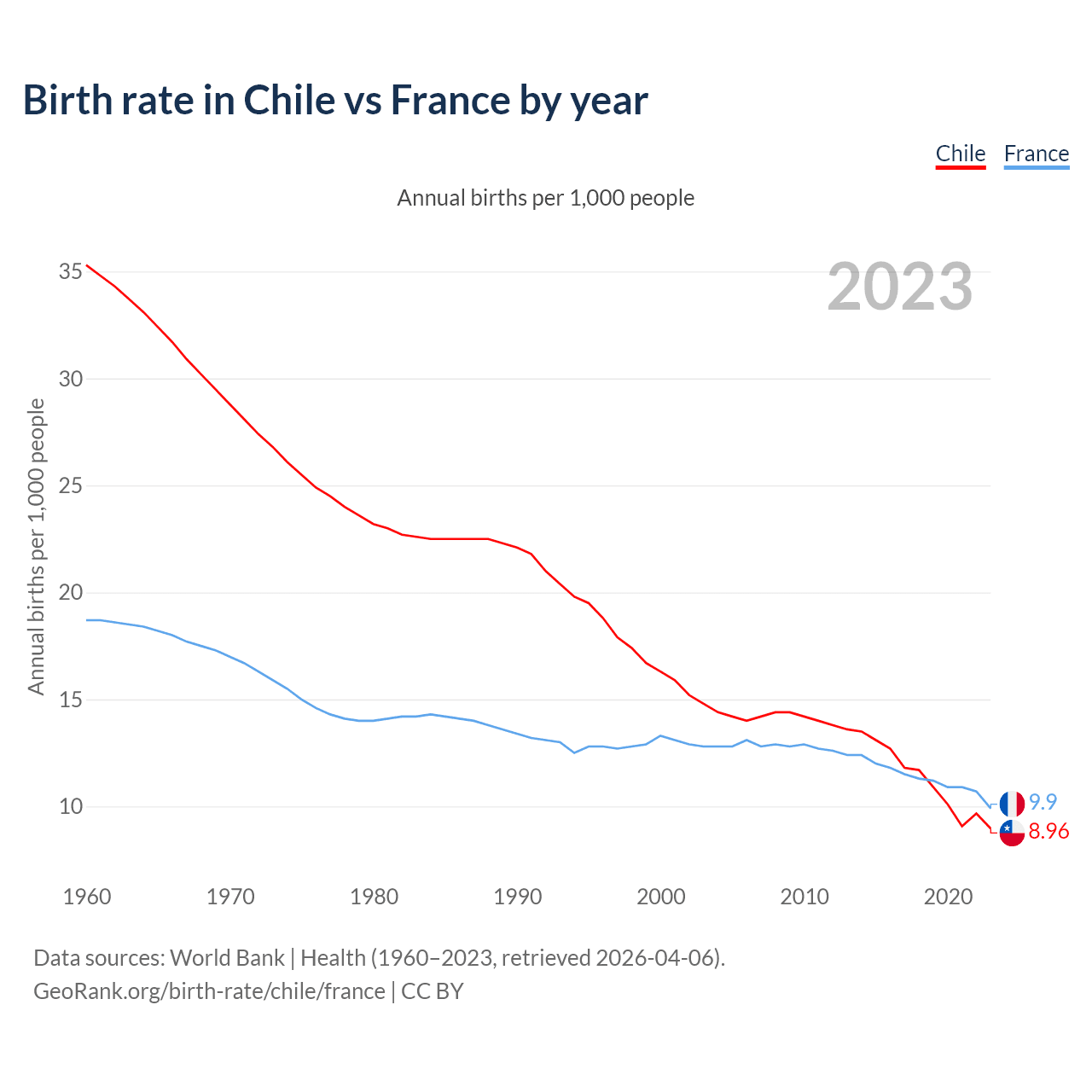 Chile has an annual birth rate of 8.96 births per 1,000 people, compared to 9.9 for France. The average number of children a woman is expected to have during her lifetime — the fertility rate, is 1.17 in Chile and 1.66 in France — 42.2% difference.